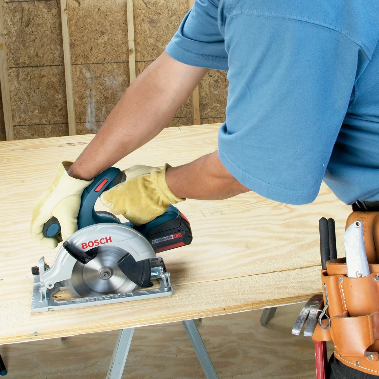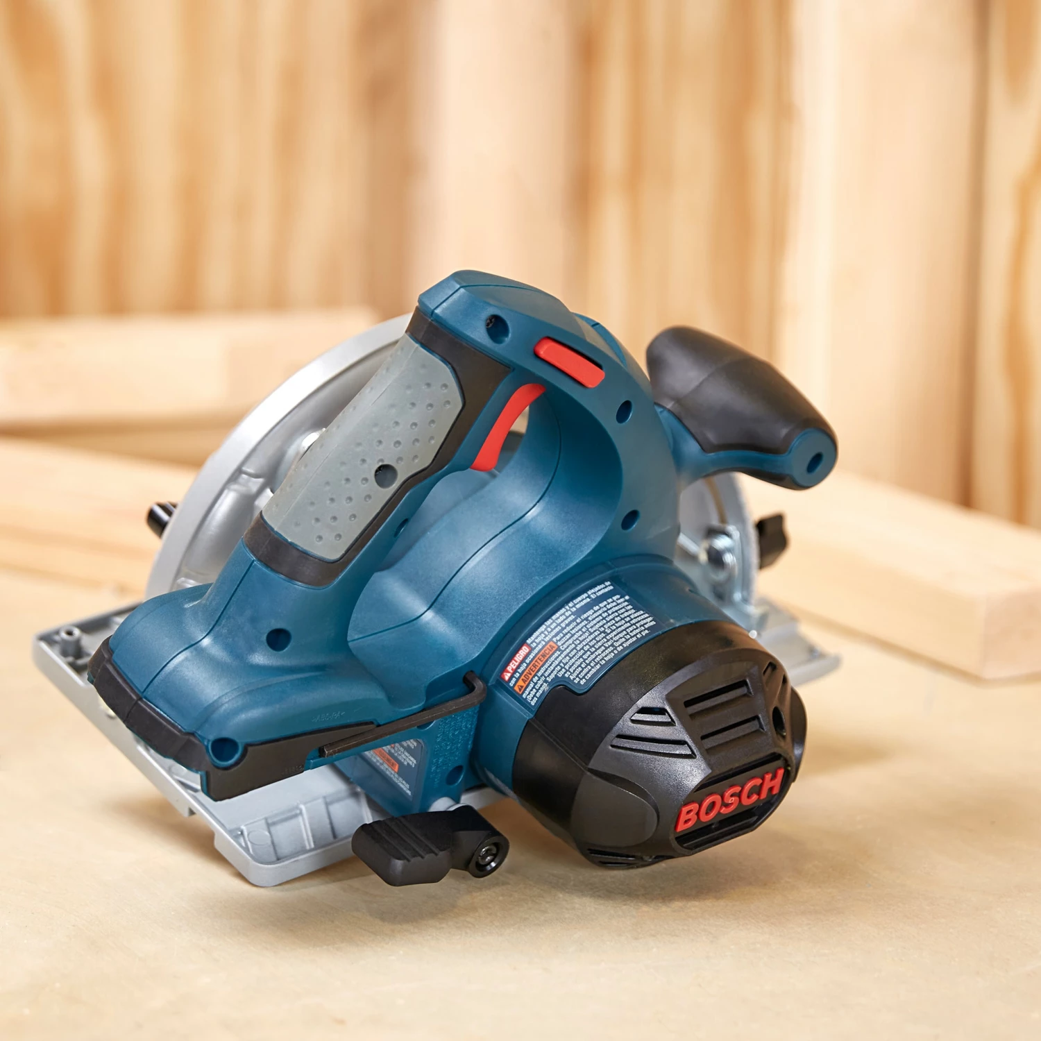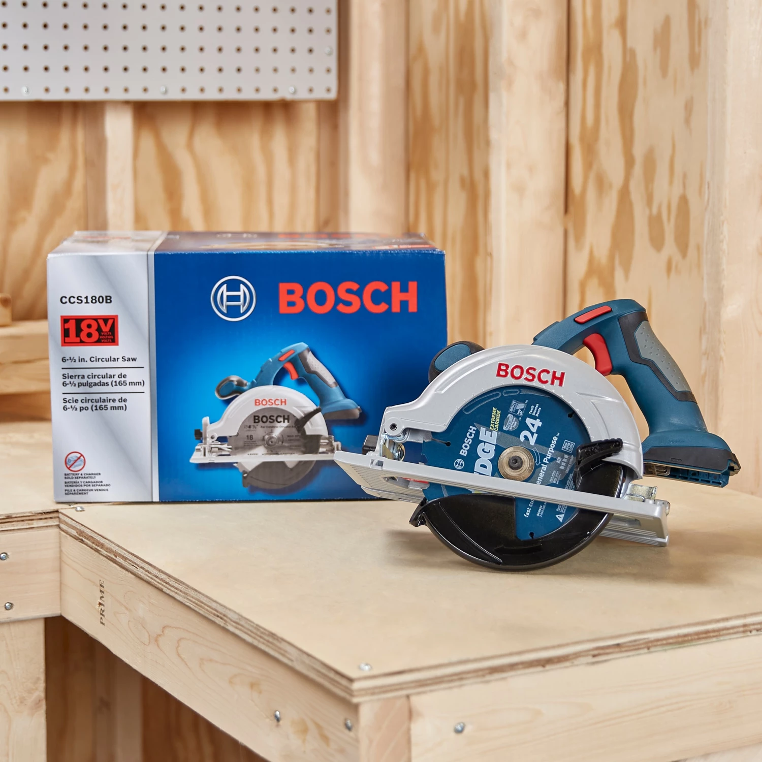 The Bosch CCS180B 18 V 6-1/2 In. Circular Saw Bare Tool can easily cut through 2x (“two by”) material across entire bevel range. This cordless saw provides a convenient 50 degree bevel range, which is handy for times when quick bevel cuts are called for in a difficult situations. The easy-to-read depth-of-cut gauge and bevel scale help make accurate cuts simple. Its ergonomic main handle that is angled for ease in pushing the saw forward. The saw includes a simple depth gauge and bevel scale, a dust blower to help keep the cut line visible, and an anti-snag lower guard to ease into the cut. This balanced saw weighs only 6.6 Lbs. (tool only, not including battery). This is a bare tool kit; the battery and charger are sold separately.