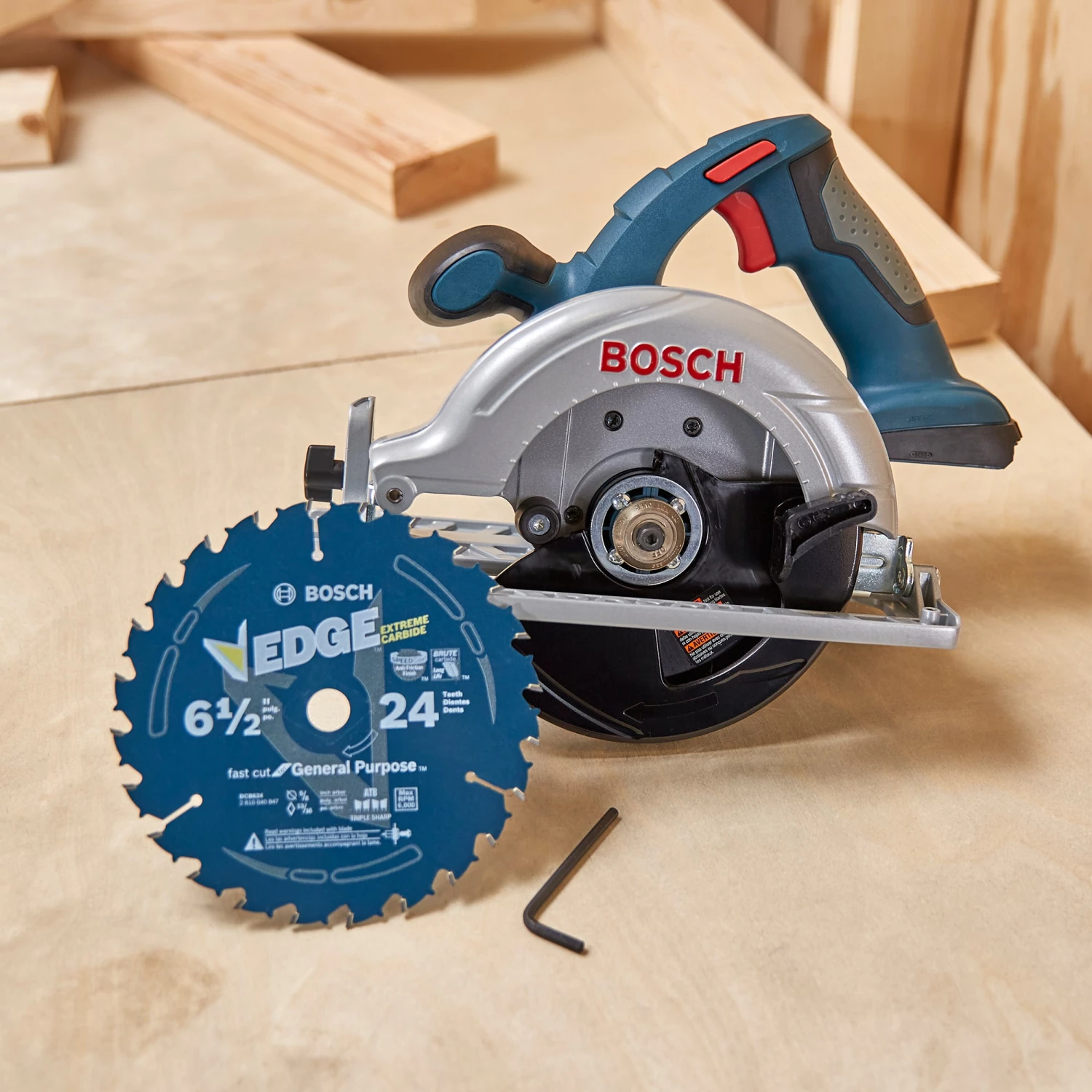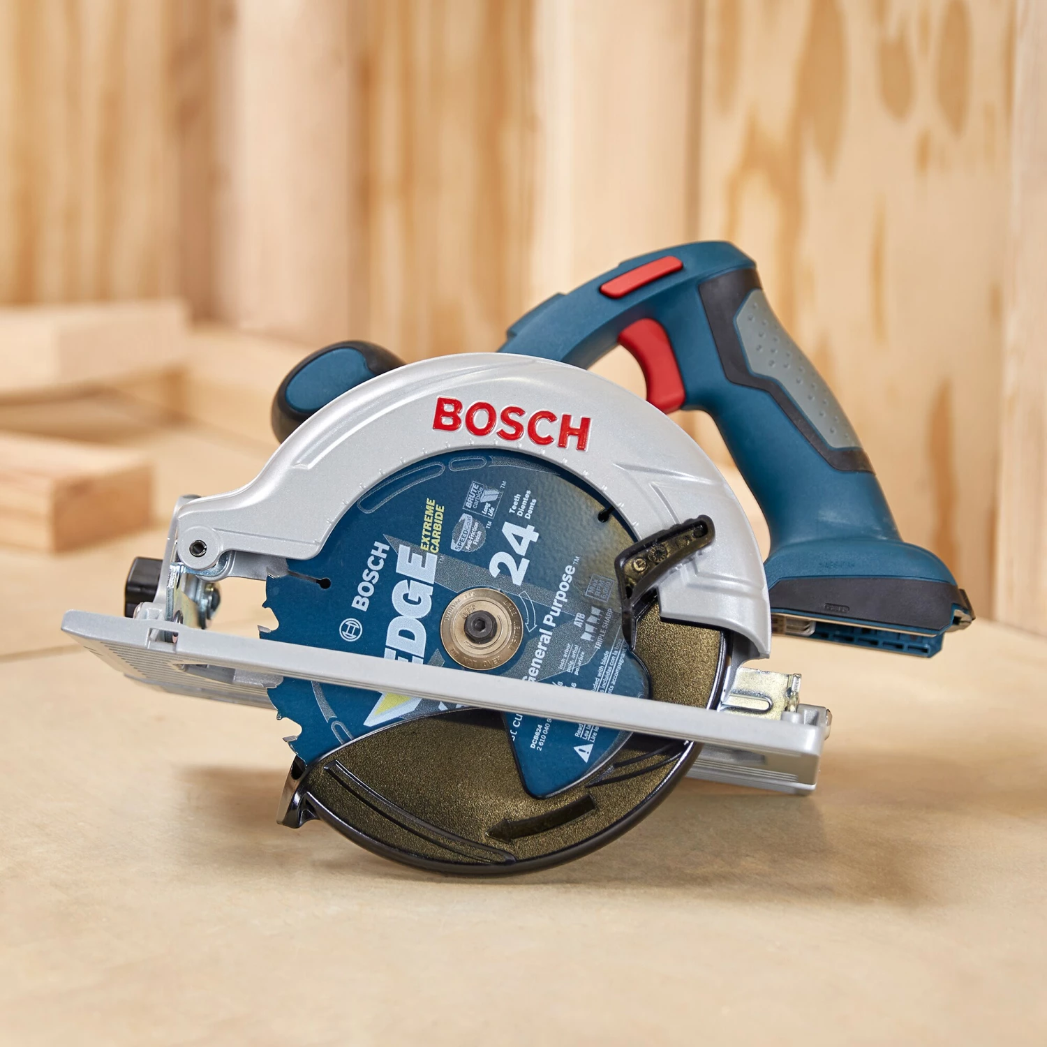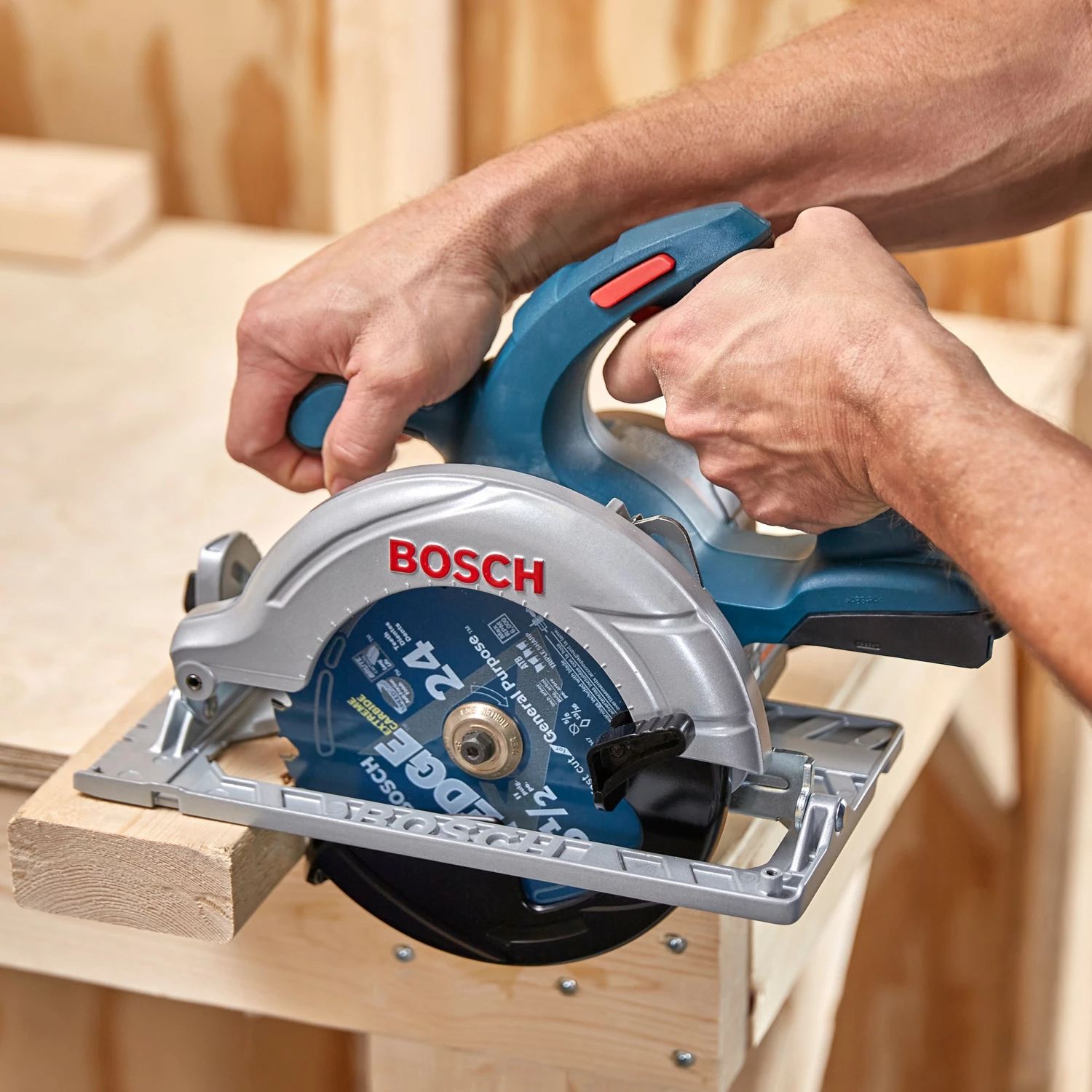The Bosch CCS180B 18 V 6-1/2 In. Circular Saw Bare Tool can easily cut through 2x (“two by”) material across entire bevel range. This cordless saw provides a convenient 50 degree bevel range, which is handy for times when quick bevel cuts are called for in a difficult situations. The easy-to-read depth-of-cut gauge and bevel scale help make accurate cuts simple. Its ergonomic main handle that is angled for ease in pushing the saw forward. The saw includes a simple depth gauge and bevel scale, a dust blower to help keep the cut line visible, and an anti-snag lower guard to ease into the cut. This balanced saw weighs only 6.6 Lbs. (tool only, not including battery). This is a bare tool kit; the battery and charger are sold separately.