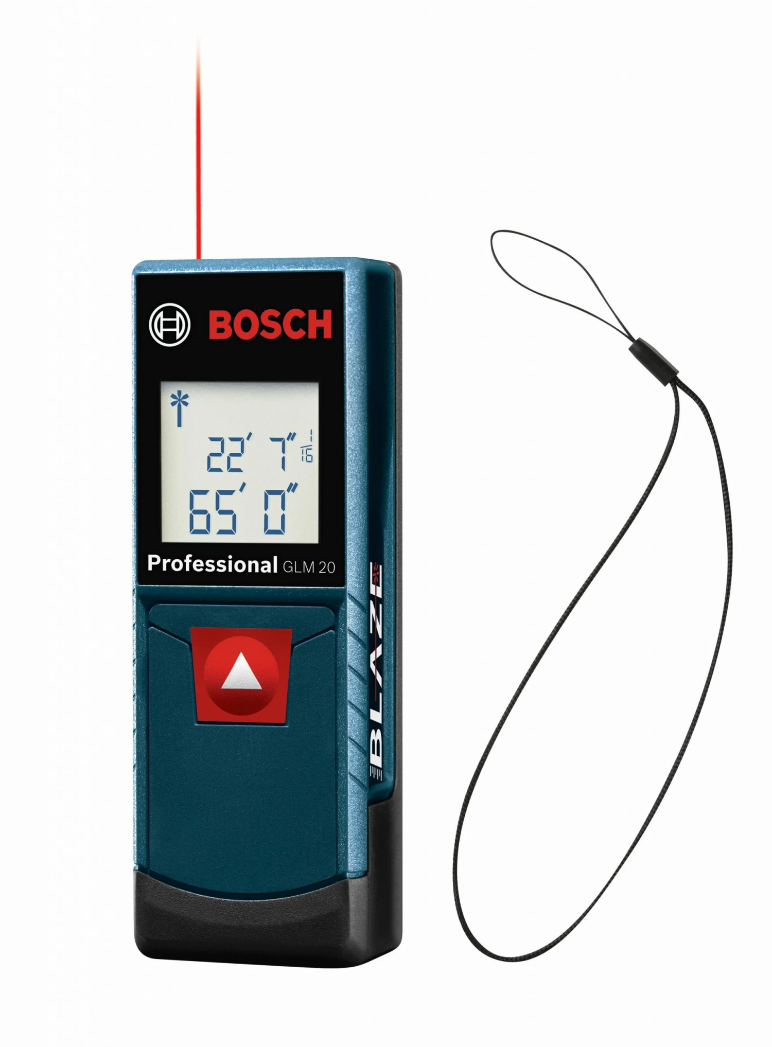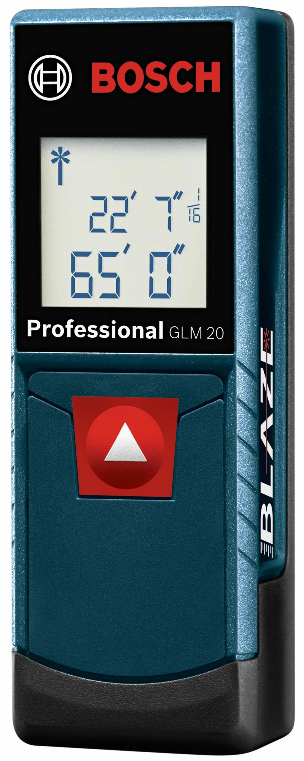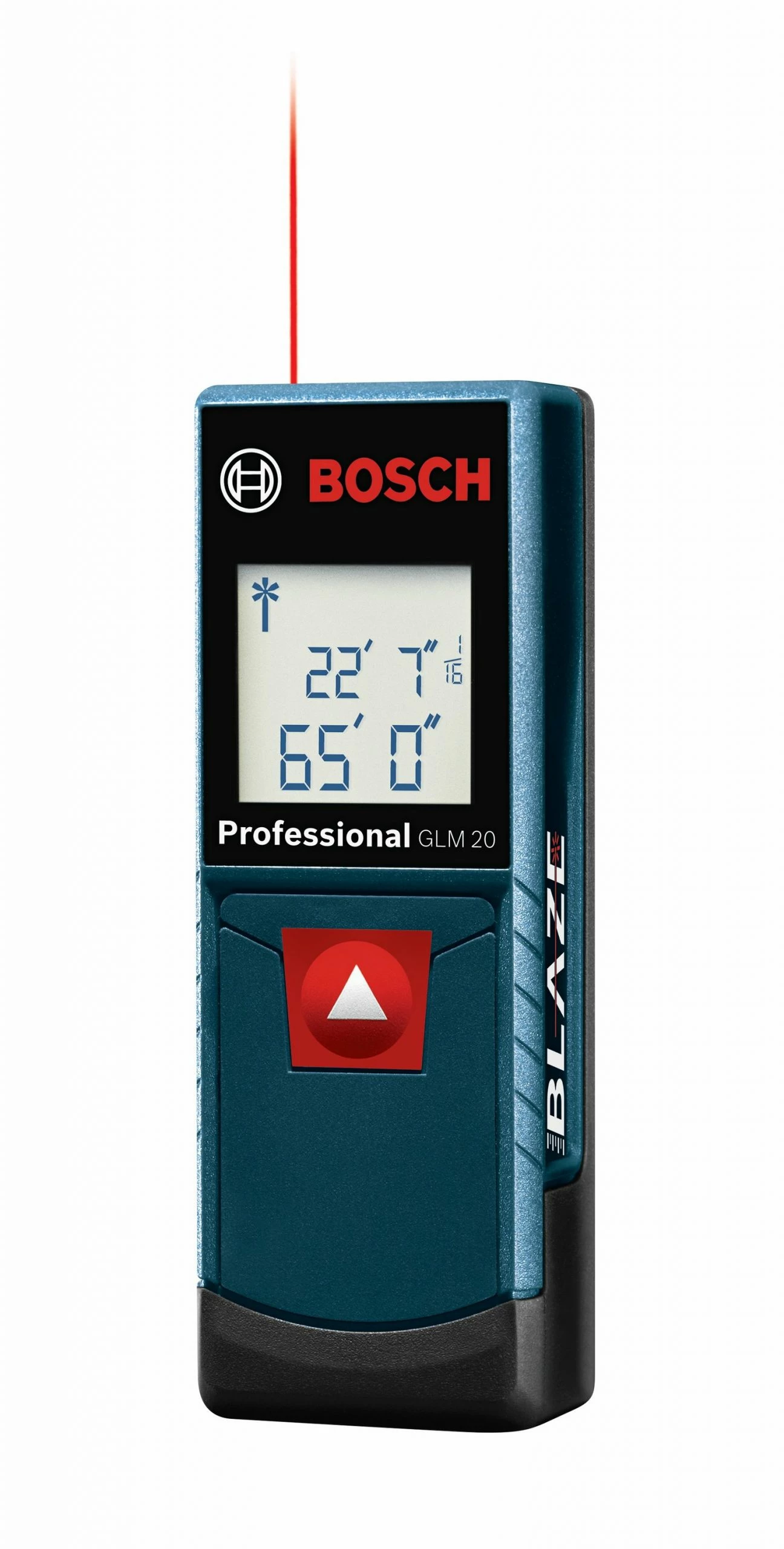 The Bosch BLAZE GLM 20 X laser measure is an easier, faster way to one-person measuring, instead of the old conventional tape measure. It is a recently introduced unit in the BLAZE lineup of laser measures – which are designed to allow users to reach farther, work faster and stay accurate. With the click of a single button, the GLM 20 X delivers laser precision technology and real-time measurement mode, taking instant and reliable measurements up to 65 Ft. This allows one person can size up the job in seconds. Square and compact by design, this laser measure is ready for anywhere portability. It has a backlit display for easy viewing, even in dark areas. The laser measure is simple to operate, so users need only press one button to get accurate measurements to within 1/8 In., and press again to hold the measurement.