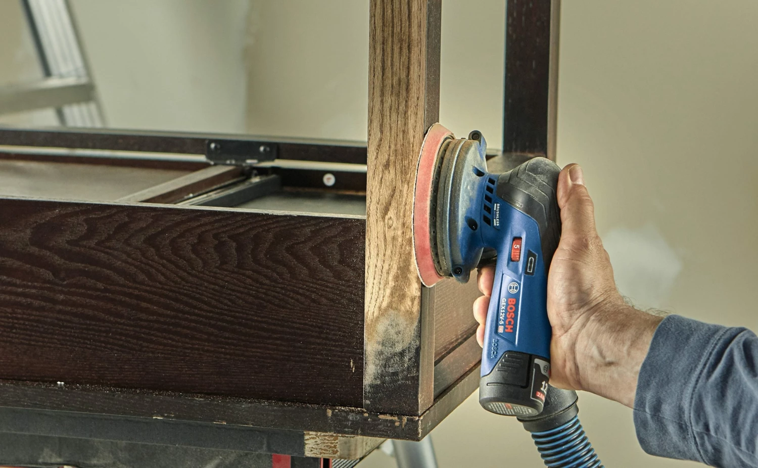 This 12V Max random orbit sander is designed to tackle hard-to-reach work areas with power and control. It features a well-balanced ergonomic palm grip, which allows your hand to be closest to the work material to avoid tilting and pressing down, for best results. The easy-to-reach on/off switch offers intuitive operation. The Bosch GEX12V-5 Brushless 5 In. Random Orbit Sander has a powerful 12V Max brushless motor, and it is engineered for professional applications. The speed selector delivers best results in different materials and applications. The sander has a 5 In. 8-hole sanding pad, which provides optimal dust collection when the sander is attached to a vacuum or a dust bag. The dust pad is ideal for both flat and concave/convex surfaces. The included dust bag allows mobile dust collection, while the tool has an interface for vacuum hose attachment. It also has soft-start technology, constant speed and a hook-and-loop backing pad. The sander has a compact shape with close-to-the-workpiece design for control in hard-to-reach areas.