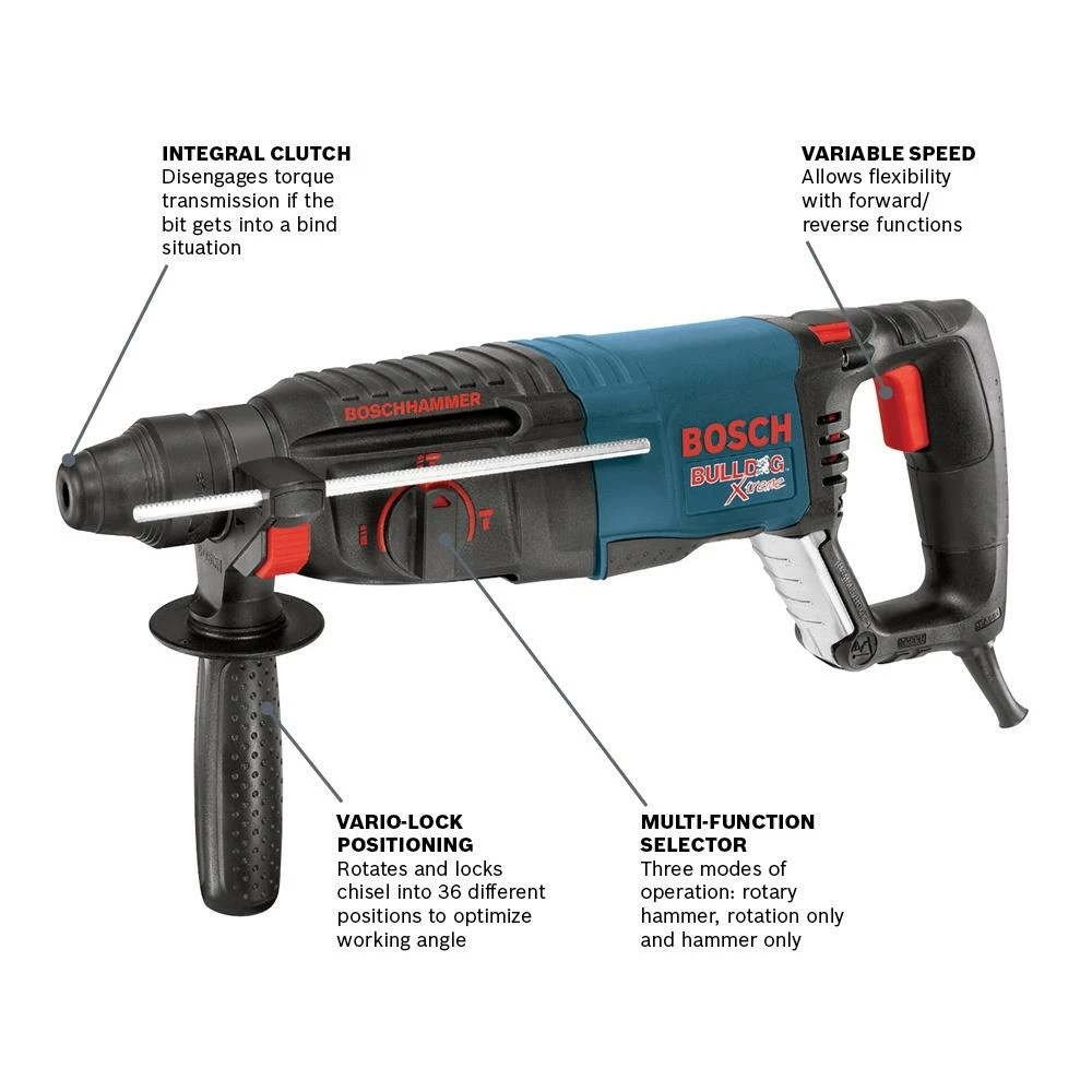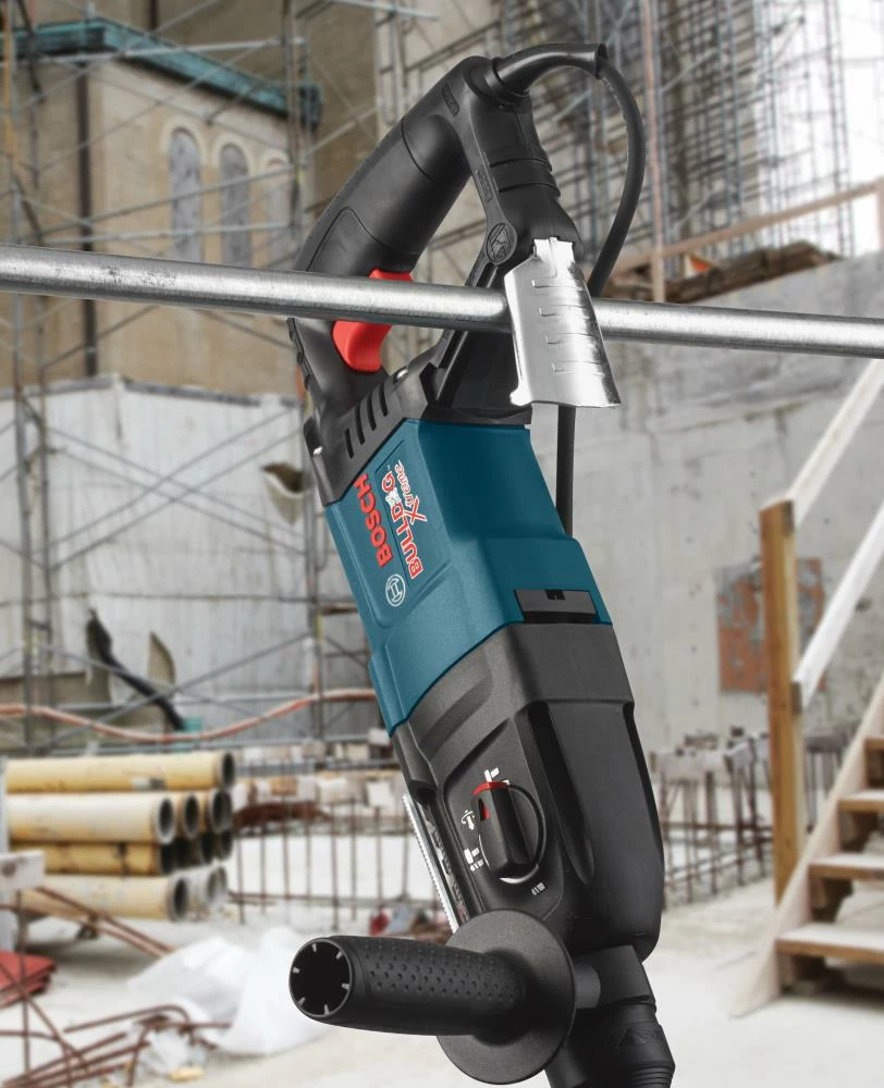 The Bosch 11255VSR 1 In. SDS-plus® Bulldog™ Xtreme Rotary Hammer is a versatile, handy tool that features a robust 8.0 Amp motor. From anchoring to large material breaking, it gets the job done right the first time. Engineered in the tradition of legendary Bulldogs, this powerful hammer delivers 2.0 Ft.-Lbs. of impact energy and 0-5,800 no-load BPM, but it weighs just 6.7 Lbs. The multifunction mode selector allows users to easily select among three modes of operation: rotary hammer, rotation only and hammer only. To optimize the chiseling angle, it has Vario-Lock positioning that rotates and locks the chisel in one of 36 different positions. It is Bosch’s PRO+GUARD™ dust system, helping users move toward OSHA Silica Table 1 dust compliance. The hammer is designed with an ergonomic D-handle for comfort. It features a variable-speed reversing trigger for accurate bit starting, and a Bosch-exclusive rotating brush plate, for equal power in forward and reverse. Busy pros will appreciate the tool’s HammerHook, which allows the user to hang the tool on the job, and the SDS-plus® system provides for tool-free bit changes.