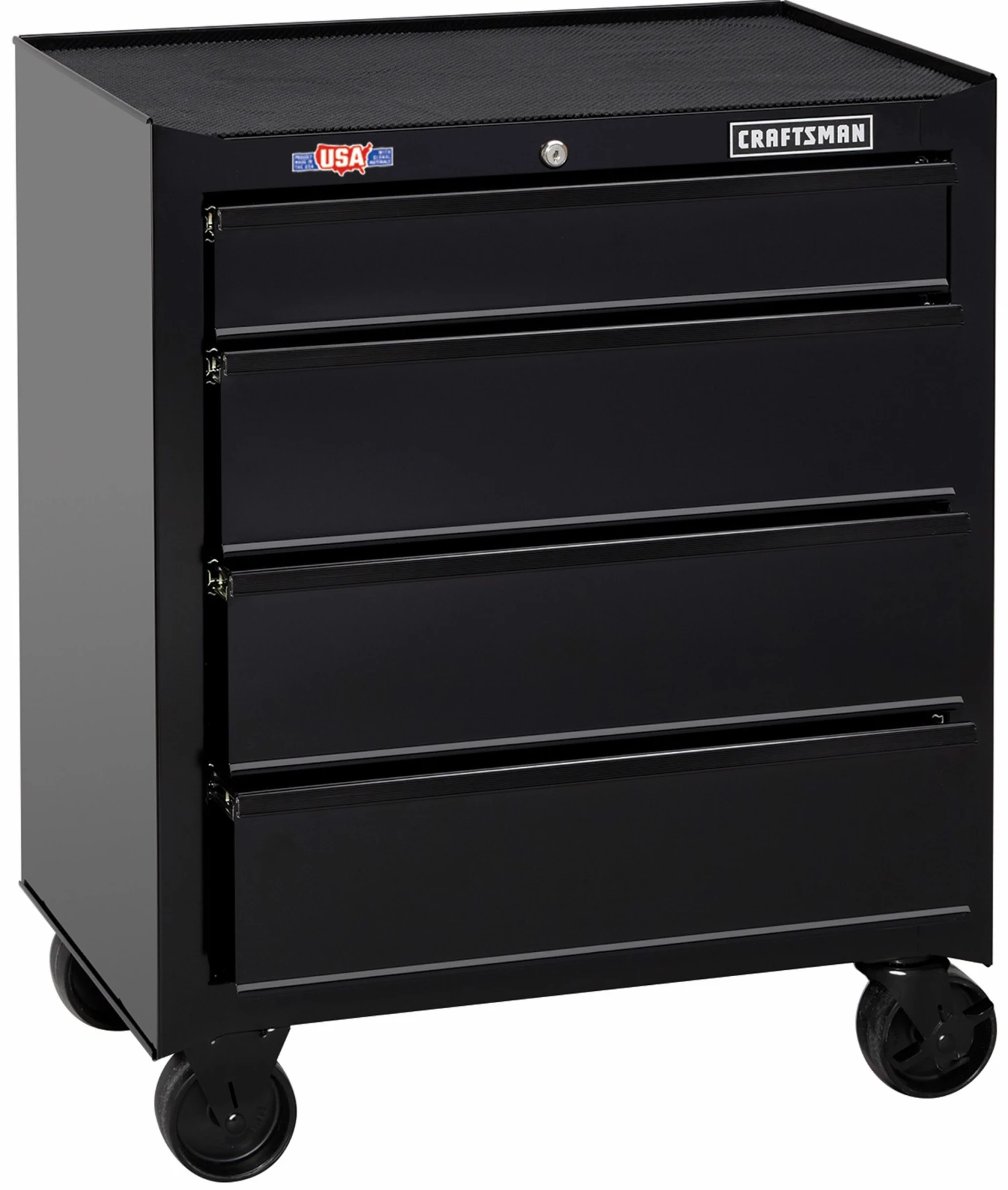 Proudly Made in the USA with Global Materials in Sedalia, Missouri. The 1000 Series 26-1/2-in Wide 4 Drawer Rolling Tool Cabinet is great for any handyman. Arrange all your tools so you can quick and easily locate the tool you need. Get the whole set and you’ll get your garage organized in no time.