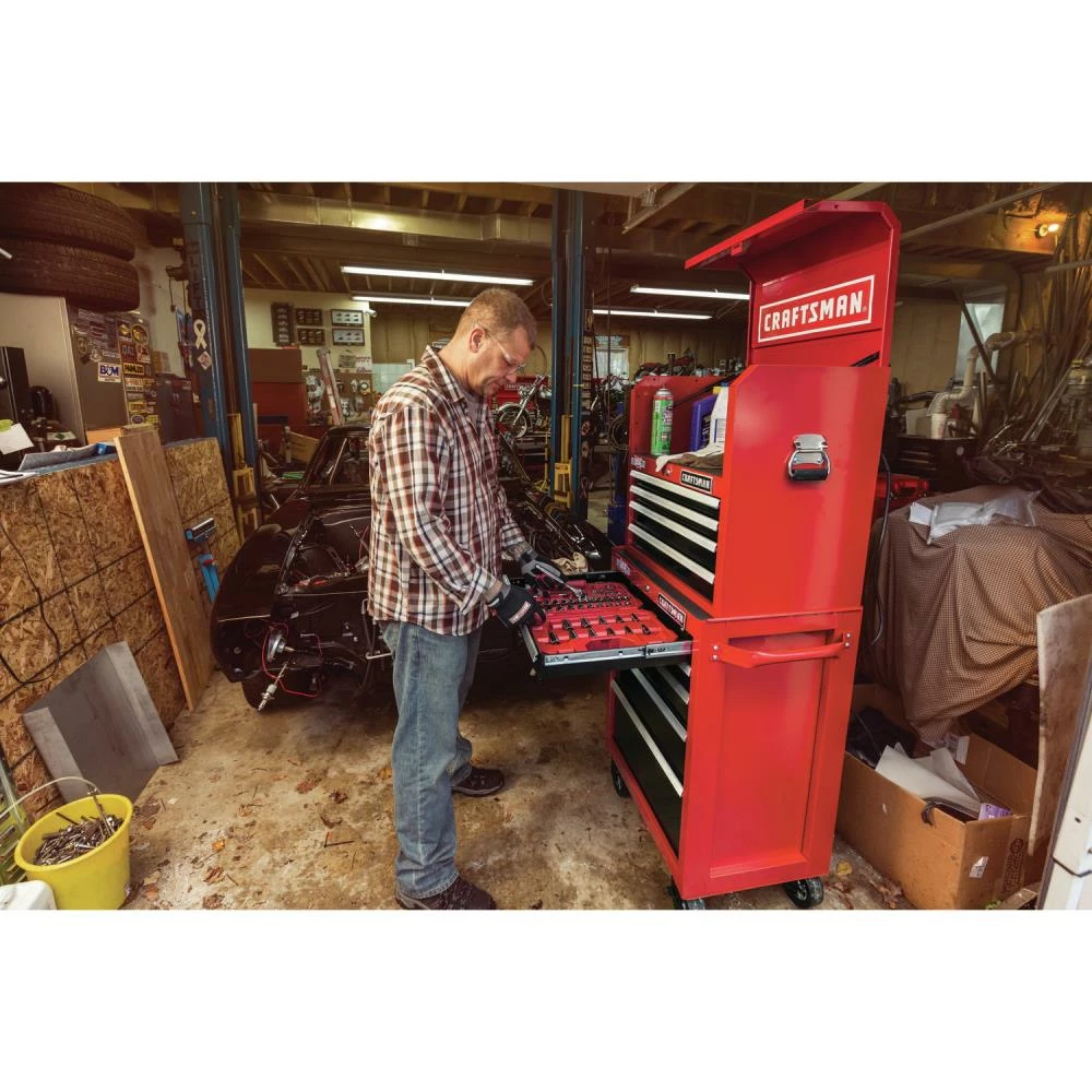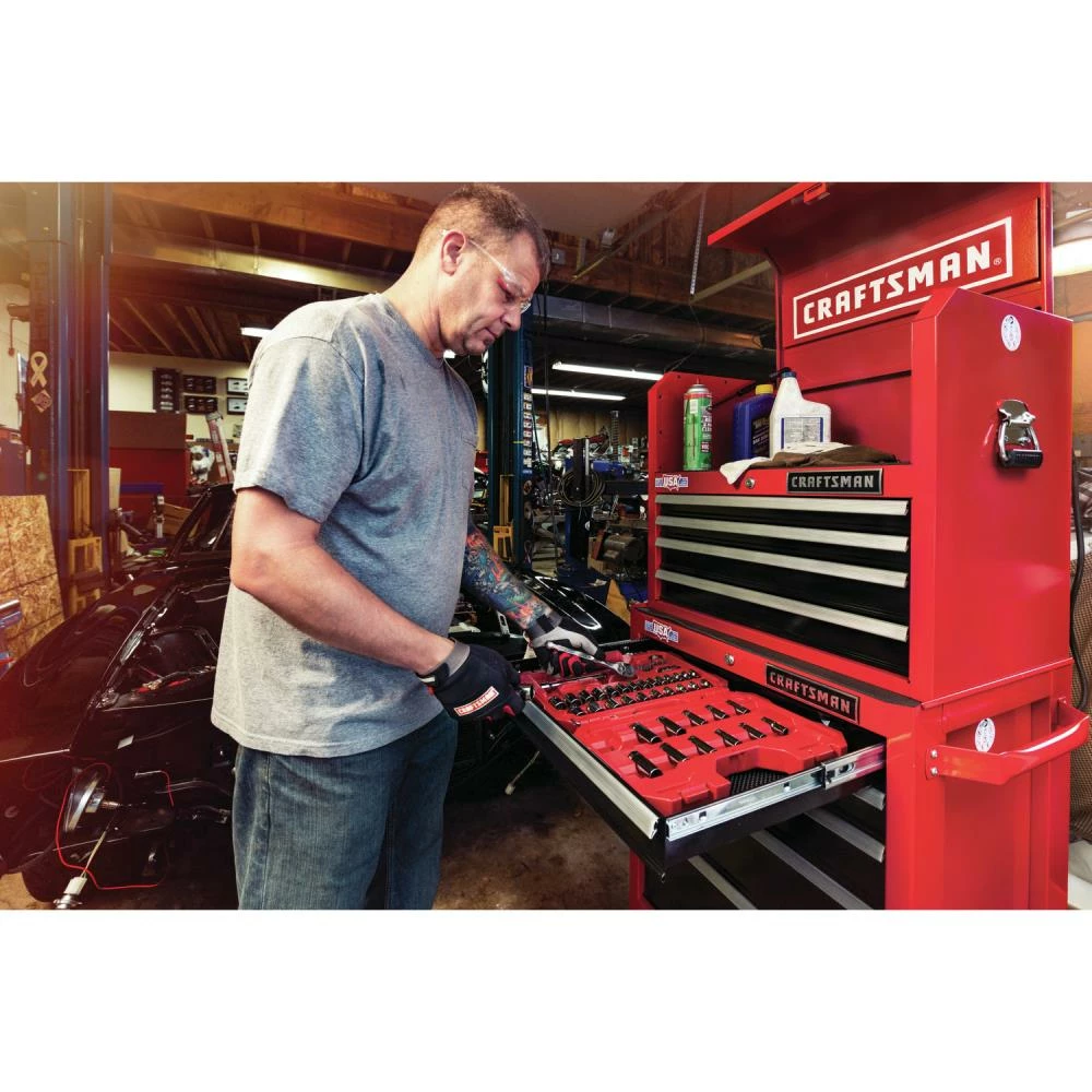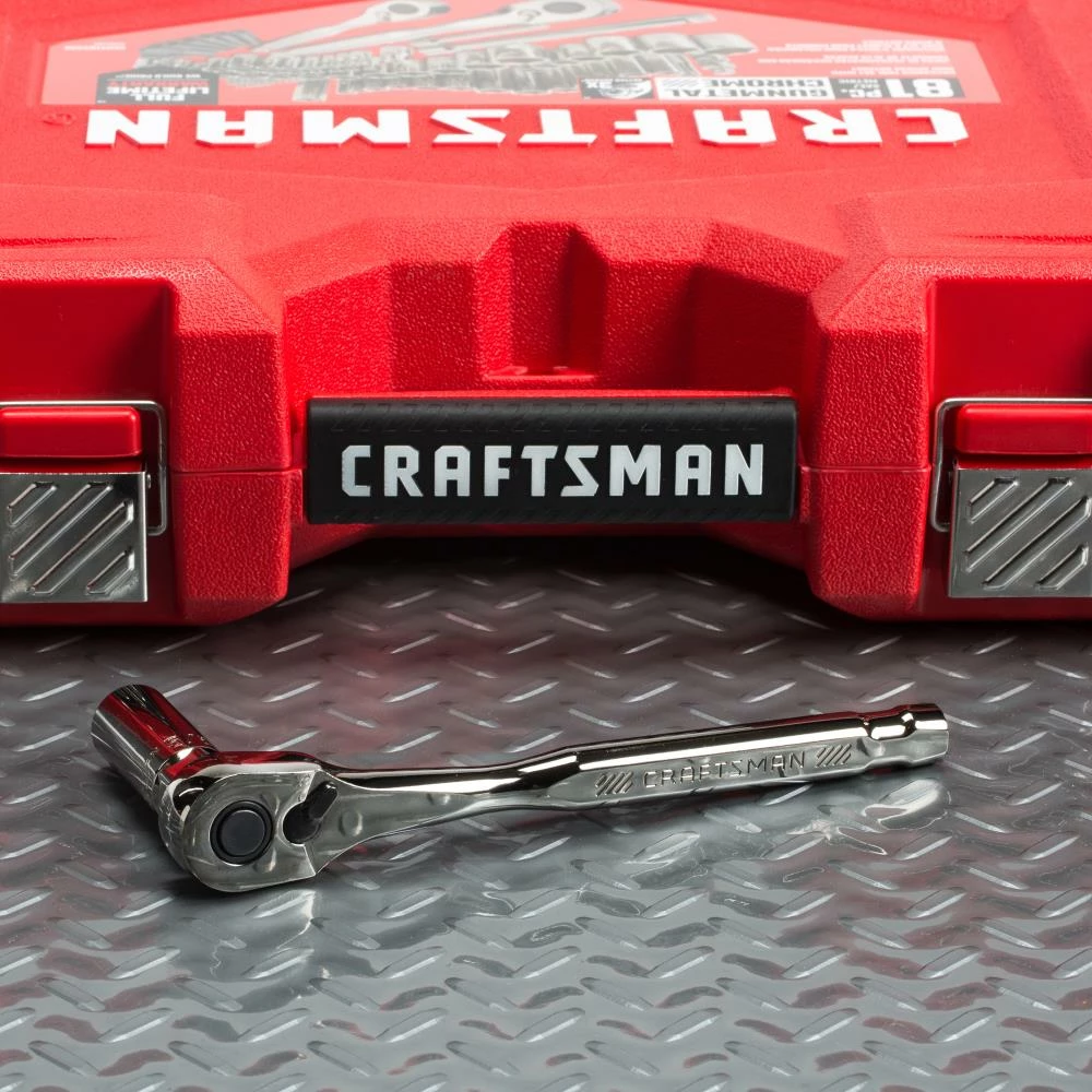 81-piece Gunmetal Chrome Mechanics Tool Set is made for the auto-enthusiast, semi-pro, or do-it-yourselfer. This set comes with the new 120-Tooth ratchet that provides maximum accessibility in tight spots. With its slim head and 3-degree arc swing, you can get into narrow spaces with ease and quickly tighten or loosen a fastener. This set also comes with two extension bars, a universal joint, a spark plug socket, a bit adapter, and a wide range of shallow and deep sockets for added utility. The gunmetal chrome finish provides durable rust resistance, easy cleaning, and a professional look. All of these components are packed in a compact mobile case perfect for storage in a toolbox, garage, a vehicle or proudly displayed on your workbench. The case has durable metal clips and metal removable hinges for splitting the case into two for storage or ready availability. The case also has exterior grooves for stacking with same size cases. Take on your next project with our Gunmetal Chrome 81-piece tool set.