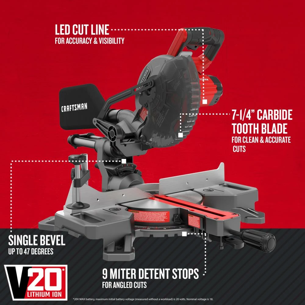 V20 7-1/4-in Cordless Sliding Miter Saw has a powerful motor designed for cutting 2x dimensional lumber, hardwoods, baseboard and trim with ease. The sliding 7-1/4-in blade allows for a cross cut capacity of up to 8-in while the 9 miter detents and single bevel blade allow for angled cuts. The LED light eliminates shadows and provides an accurate easy cut line to follow. With a lightweight design and side carry handles provides the user with additional portability.