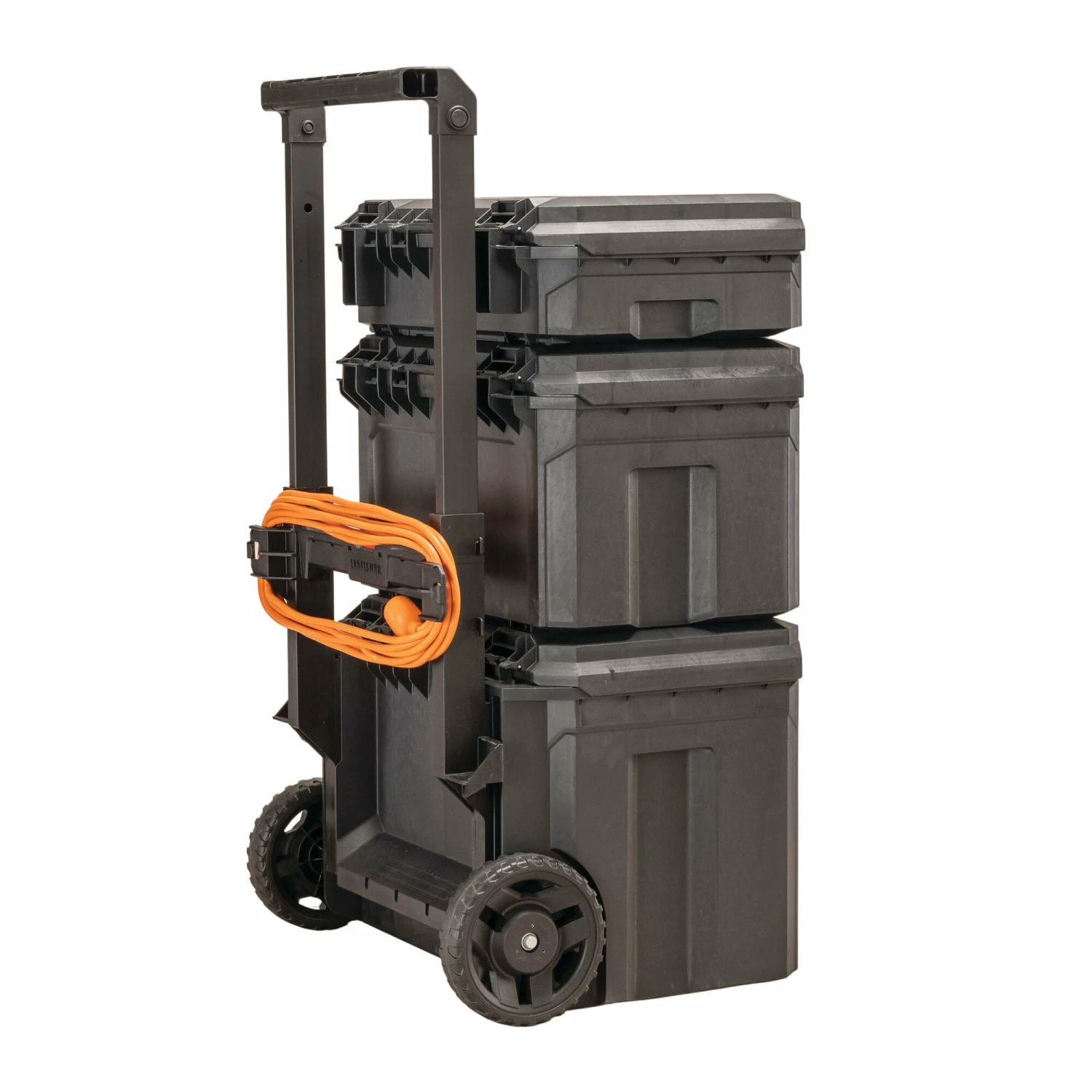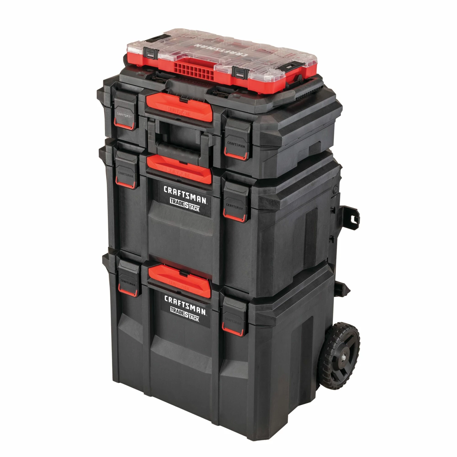 Suitable for any outdoor job or project, the TRADESTACK™ 22-in Rolling Tower Premium Storage Stack includes a suitcase, deep toolbox, and a rolling unit. The TRADESTACK™ units connect to each other, automatically stacking via a drop and lock mechanism and easily separating with a one-touch release. They are IP65 dust and water resistant, have a large storage space to fit large and heavy tools, and feature durable 7-in wheels that enable smooth mobility for convenient transport to any destination. Compatible with VERSASTACK™ modules, and CRAFTSMAN® organizers and tool sets via an included adaptor, you will be ready to meet all your stackable storage needs. Made in USA with Global Materials.