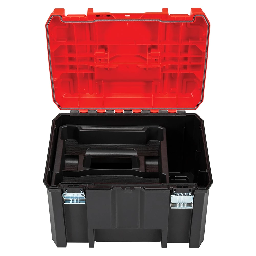 VERSASTACK™ water sealed deep box with flat top offers new innovation in storage options. This flexible platform allows different combinations: all units can stack on top of each other and able to connect with durable side latches for easy carrying and safe stacking. This unit can be used for storage of corded and cordless tools and features a removable tray for access to essential tools.