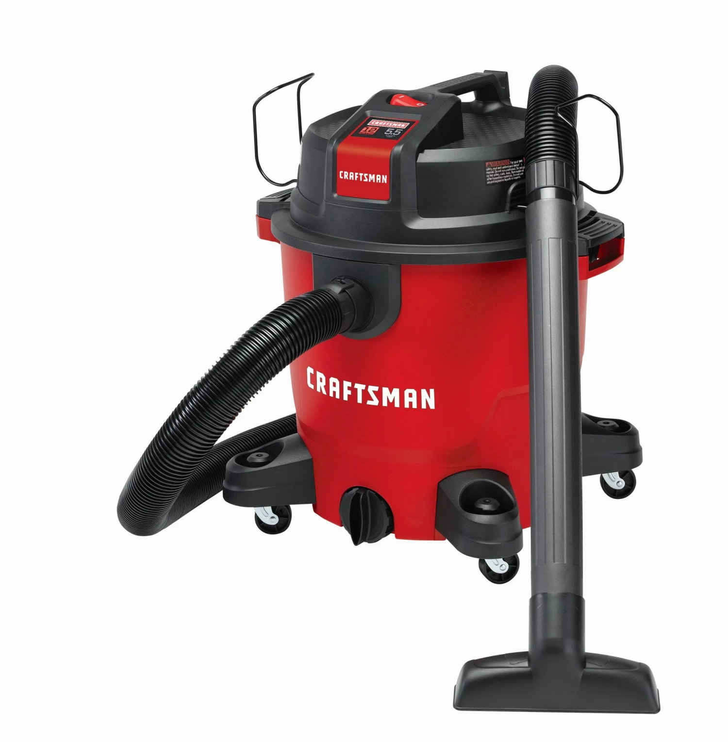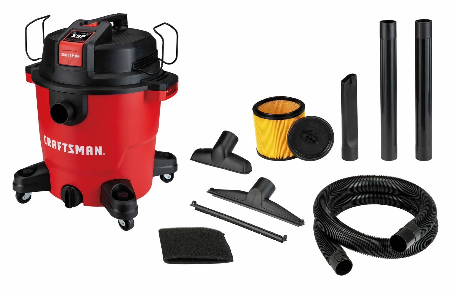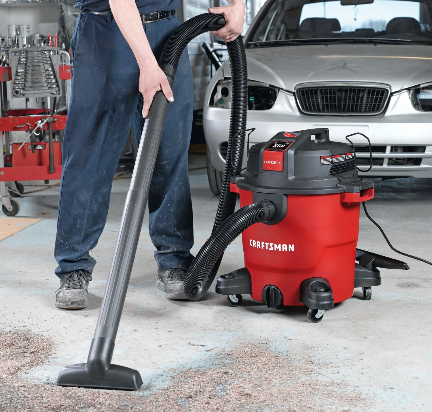 The full-size Craftsman 12-gallon wet/dry vacuum is designed to tackle the toughest projects that the home, shop, or jobsite can throw at you. The 12-gallon tank offers plenty of room for big messes and the high performance 5.5 peak HP† motor makes sure the tank gets filled, whether it’s with sawdust from the shop or debris from the jobsite. With its unique flat power head design, you have a place to conveniently store tools so they are easily accessible when needed. The on-board hose, power cord, and accessory storage allow you to keep all of your attachments organized and in one place. The wide-set casters and balanced top handle make for convenient transportation from one place to the next. This wet/dry vacuum comes standard with a wide array of accessories so you have the tools to get the job done no matter what. Turning this vacuum into a blower to remove debris from your yard or workspace could not be easier – all it takes is a simple conversion.