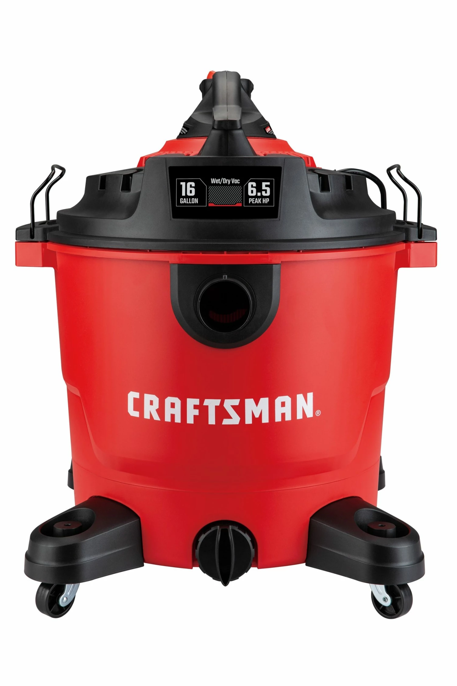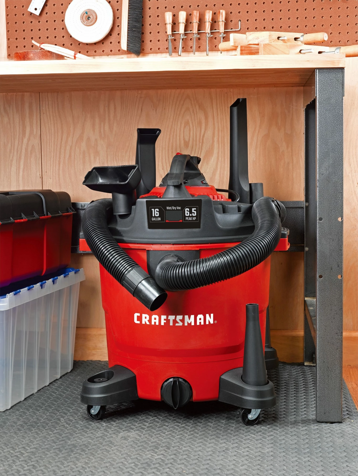 This Craftsman wet/dry vacuum is a unique 2-in-1 unit that allows users to switch between a wet/dry vacuum and a high powered, handheld blower with the push of a button. This 16-gallon wet/dry vacuum is the perfect size for a variety of tasks around the home, shop, or jobsite. With a 6.5 peak HP, this vacuum makes cleanup easy, whether it’s dust collection in the shop or liquid spills at home. Turning this vacuum into a detached, handheld blower to tidy up the yard or garage could not be easier – simply push the release button and lift the blower out of its cradle. With a blowing speed of 265 MPH, this tool can handle the toughest debris. The balanced top handle design and durable casters provide stable transportation during and after use, and the on-board accessory storage ensures that all of your tools stay organized and in one place.