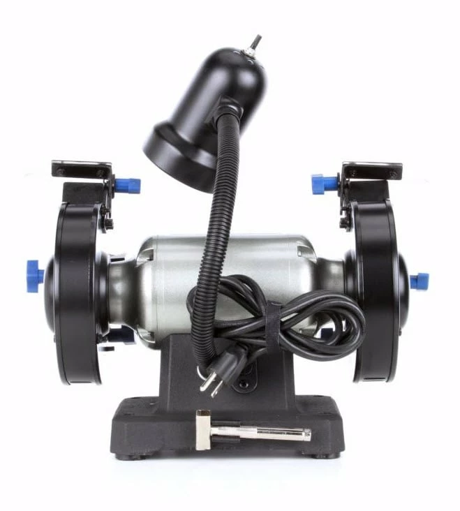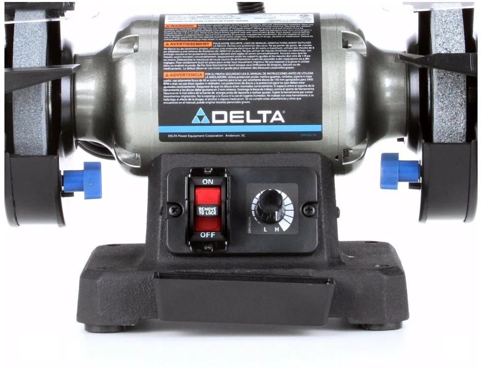 Sharpen blades, bits and chisels with ease with this Delta 6-in bench grinder. The 36 and 60 grit wheels allow you to tackle a variety of sharpening and grinding tasks without having to worry about frequent wheel changes. Its 2.5-amp induction motor delivers variable speeds from 2,000 to 3,400-RPM, so you can set the speed to suit the task. A built-in light keeps your work space illuminated, and the grooved tool rests make it easy to accurately position your work for the best results. Featuring full-size safety shields, sparks are kept at bay during operation for a safer work environment. The tool’s cast-iron base features corner holes, so you can easily mount it to your benchtop.