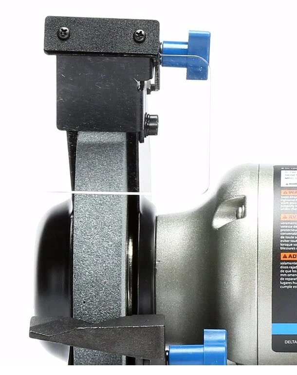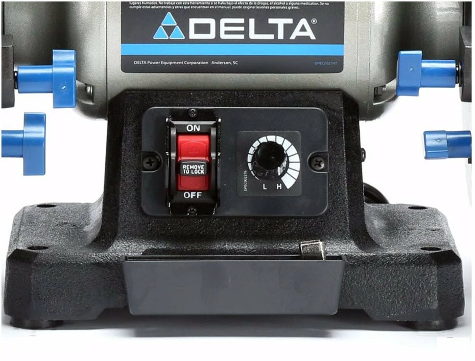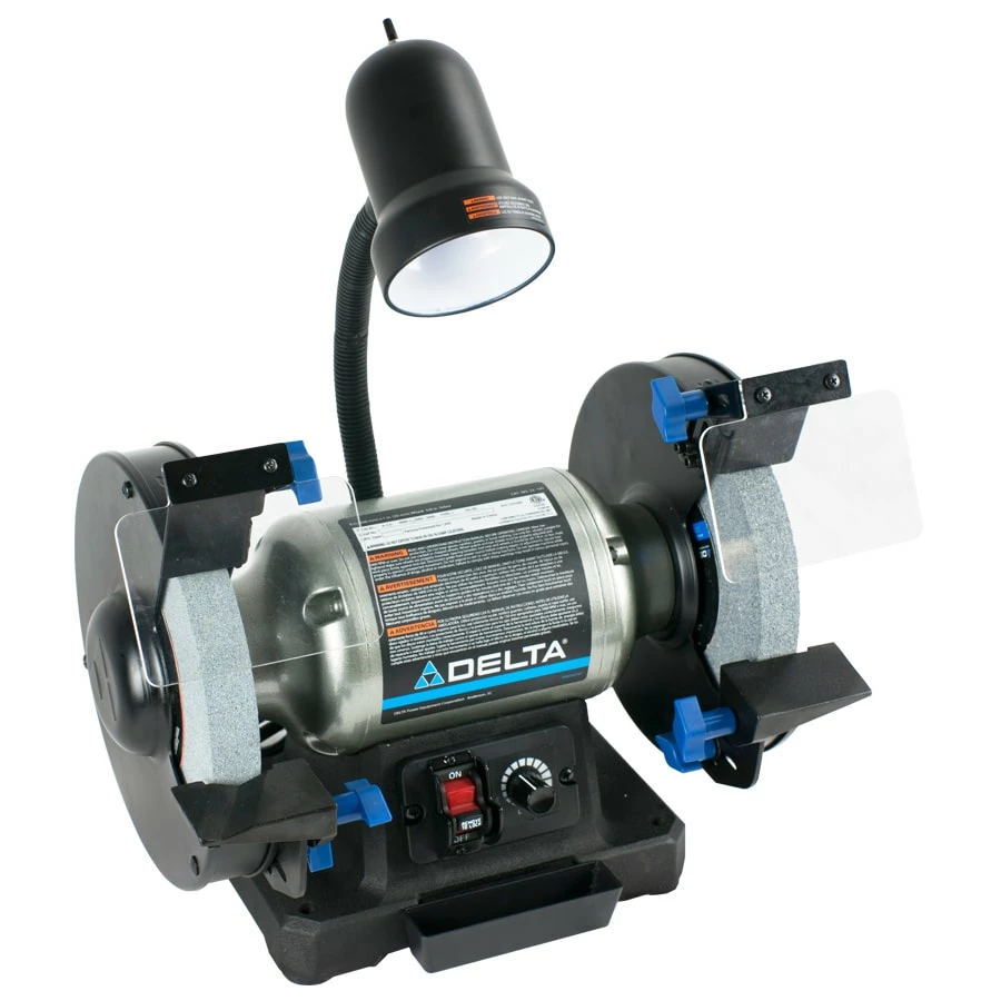 Dull tools are a thing of the past with this Delta 8-in bench grinder in your workshop. Featuring a 5-amp induction motor that delivers variable speeds from 2,000 to 3,400-RPM, you can switch between sharpening and polishing or buffing tasks with ease. Two grinding wheels, including a 36 grit wheel and a 60 grit wheel provide versatility and minimize frequent wheel changes. A built-in light brightens your work space, allowing for precise results when sharpening your ax, mower blades or smoothing rough edges. Eye shields offer protection from sparks and other debris, keeping operation safe.