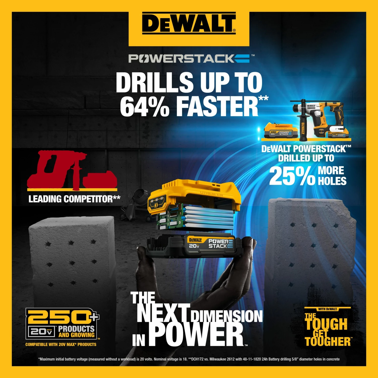 Introducing THE NEXT DIMENSION IN POWER™ with the 20V MAX DEWALT POWERSTACK™ Compact Battery 2-Pack. Get 50% more power with a 25% smaller footprint using batteries that work with the 20V MAX tools and chargers you already have. These batteries provide twice the lifetime and features an impact-resistant, overmolded base with non-marring material. Take advantage of our lightest and most powerful battery as the rubber overmold base and twice the lifetime combine to form a dependable Lithium Ion solution.