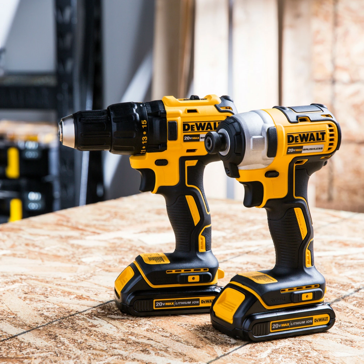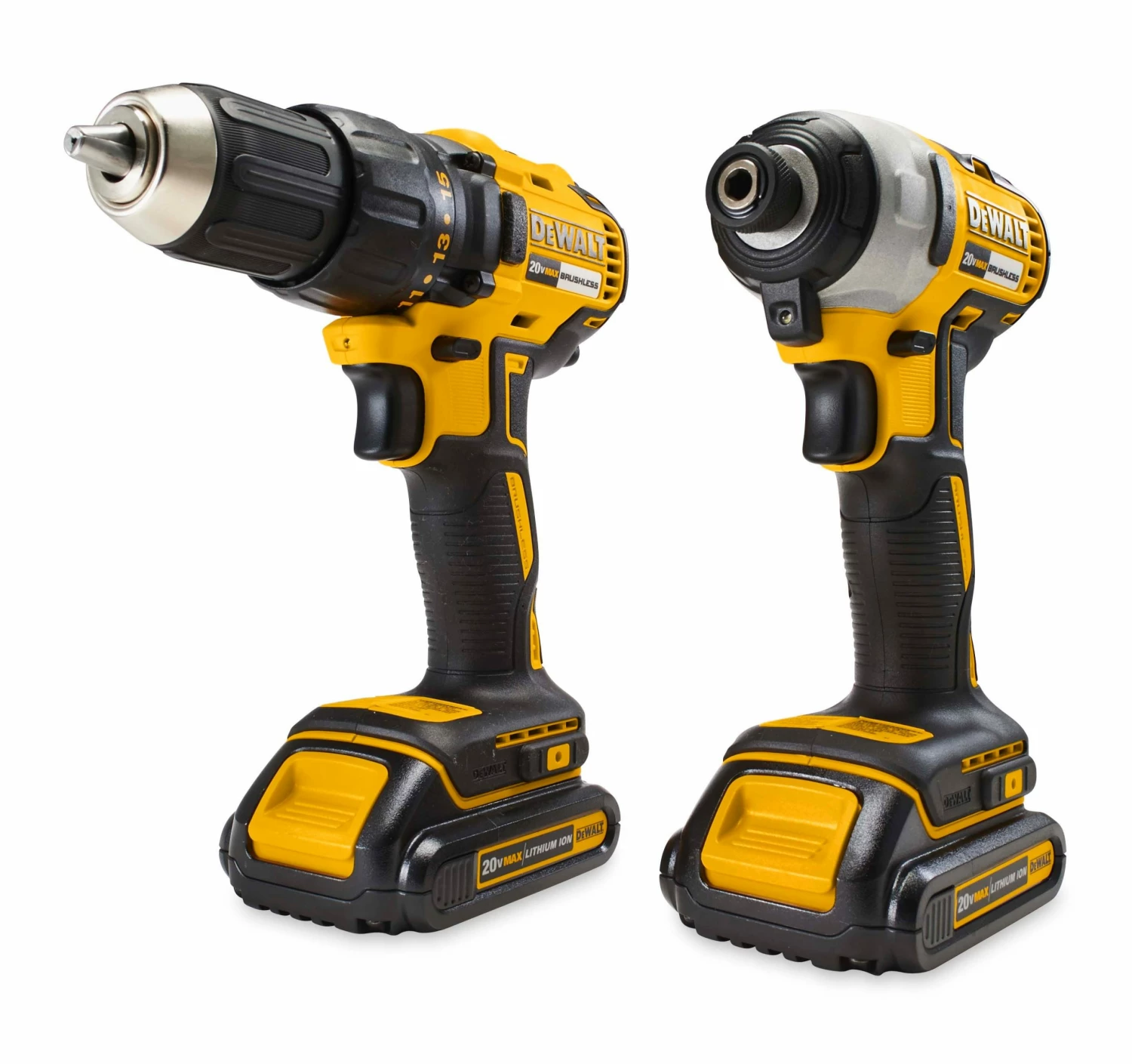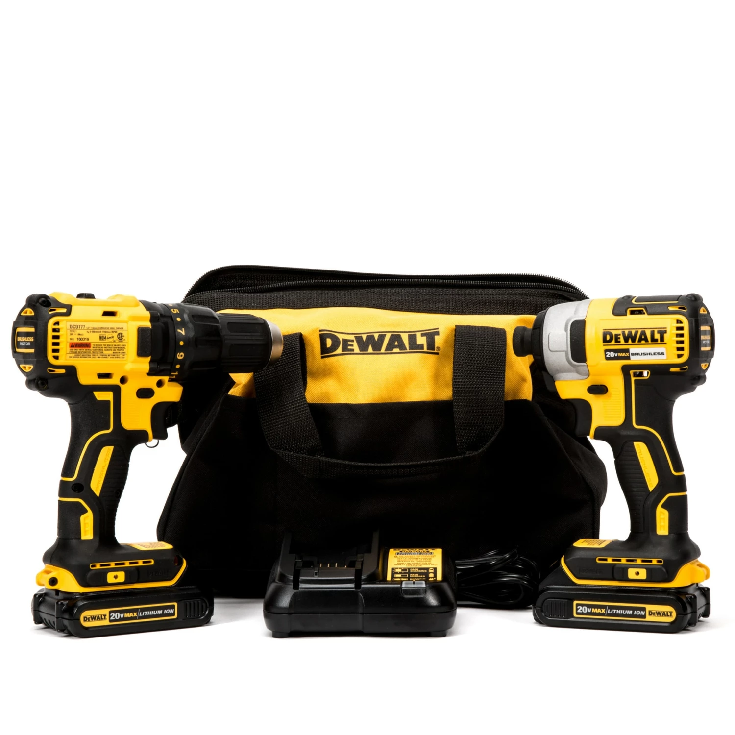 - Kit includes one DCD777 20V MAX compact Brushless drill/driver, one DCF787 20V MAX compact Brushless 1/4-in impact driver, two 20V MAX Li-ion battery packs, one charger and one kit bag
