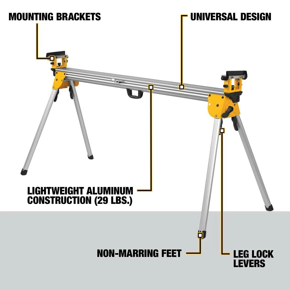 The DWX723 heavy-duty miter saw stand is designed to work with all brands of miter saws. Lightweight aluminum construction (35-lbs) allows for easy transport and leg lock levers allow quick set up. 5-1/2-ft beam extends to support up to 16-ft of material and up to 500-lbs.