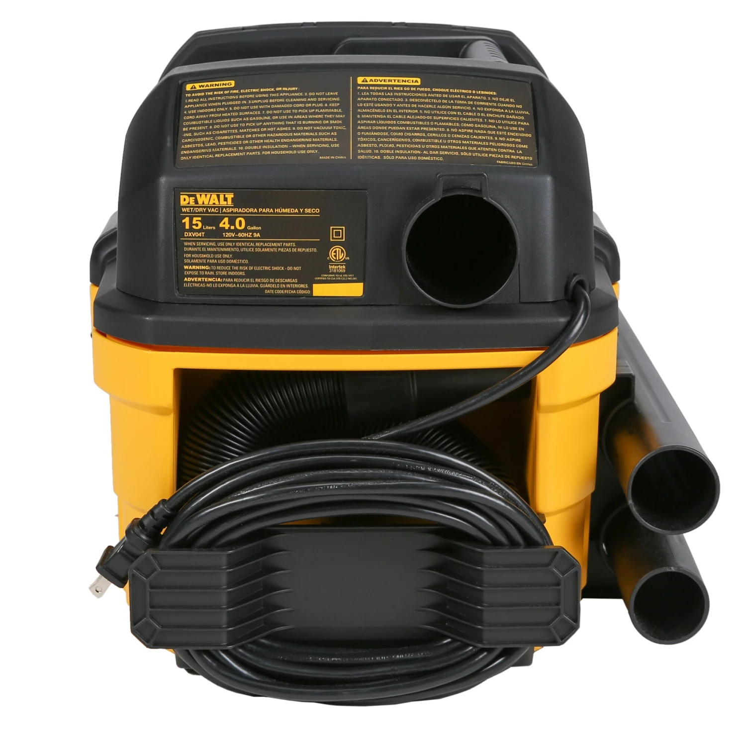 The 4 Gallon wet/dry vacuum is portable and easy to bring to any job with its convenient toolbox shape and stay carry handle. With a powerful heavy duty motor, this vacuum provides maximum suction power for heavy duty pickup. It features a fine-dust cartridge filter for small, dry debris and wet materials, strong handle for easy carrying, large on/off switch with water-resistant design for safe and quick access, convenient, built-in 20 Ft. power cord and accessory storage to get all your accessories/tools organized.