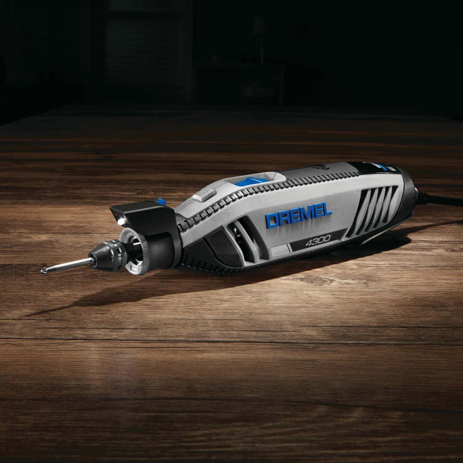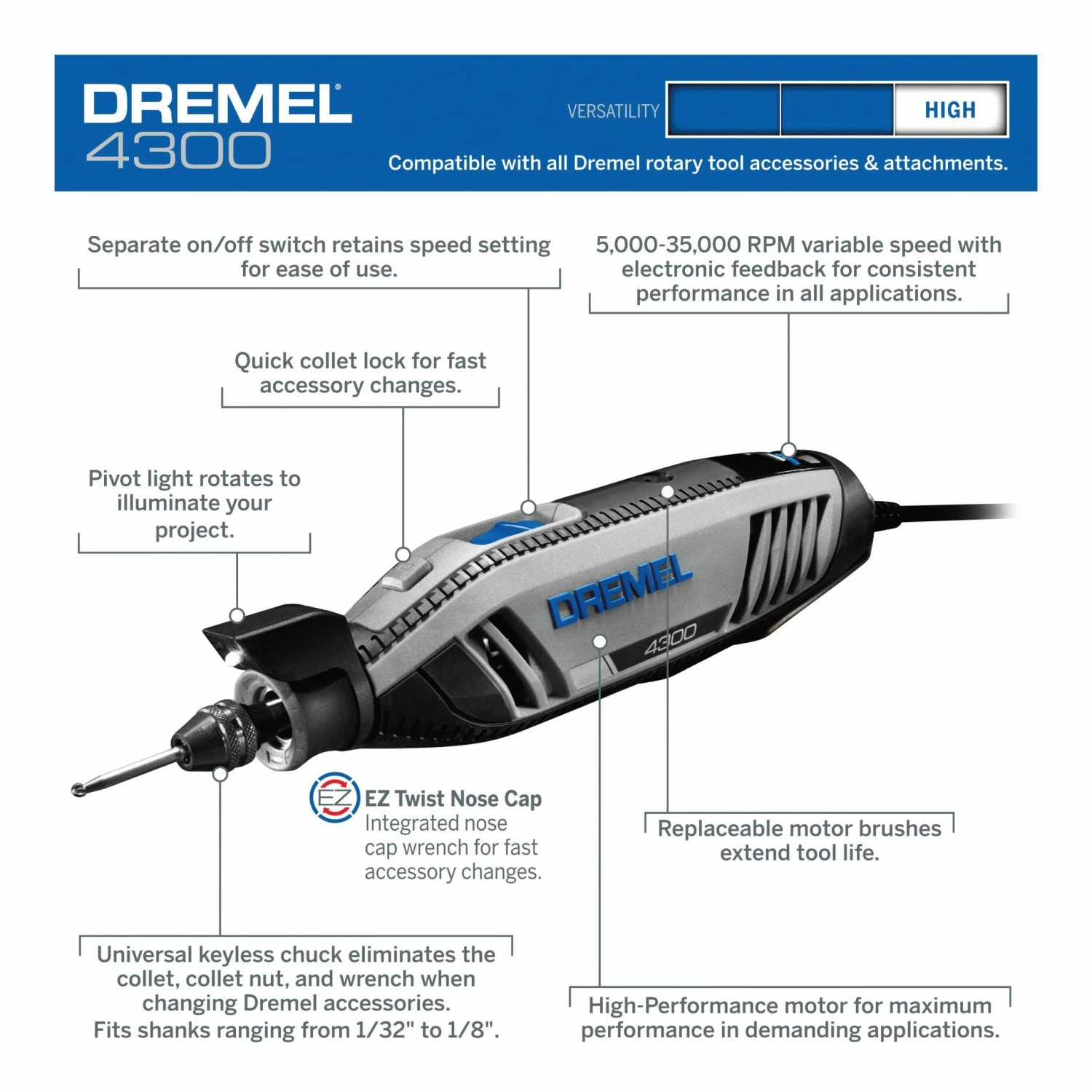 Endless possibilities, one tool. From sanding to grinding, and routing to cutting; the Dremel 4300 produces power from job to job. The 4300 is the first Dremel rotary tool to allow tool-less and collet-less accessory changes with the inclusion of the keyless chuck. The chuck accepts all Dremel accessory shank sizes for fast and convenient accessory changes without ever using a wrench. Featuring the all new Pivot Light, your projects are well-lit with an optimum line of sight since the light pivots to direct illumination where you want it. Experiencing the full range of Dremel rotary tool applications is easier than ever because the 4300 offers our most powerful motor with built-in variable speed and electronic feedback circuitry. And the slim, ergonomic body design provides a comfortable 360-degree grip zone no matter how you hold it for extended ease of use. The completely redesigned airflow system lets the Dremel 4300 run cool, quiet, and smooth so completing projects are more enjoyable than ever. The Dremel 4300 is perfect for sharpening garden tools including lawn mower blades. This variable speed rotary tool is a wood engraver, metal engraver, glass engraver and etcher, detail sander, drill bit sander, and a micro drill.