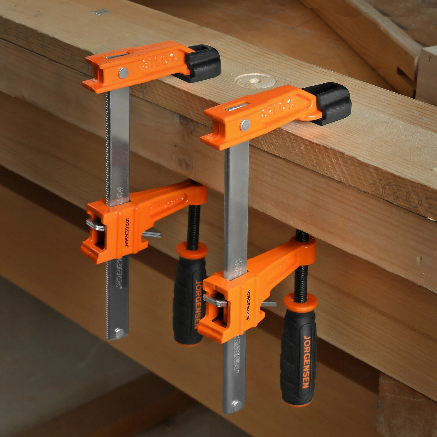 Our Jorgensen style 3700-LD light duty steel bar clamps are ideal for all types of light duty clamping and is a workhorse for its size and design. They are used by do it yourself, hobbyist, carpenters, cabinet makers, woodworkers, metalworkers and professional trades people of all types. Protective pads made of thick, durable plastic protect your work. Clamps rest parallel on work surface for ease of work placement and adjustment. It is a sliding head design: the sliding head is threaded to accommodate the screw with our easy grip handle and swivel pad. All adjustments are made in the movable sliding head, making this style fast acting, easy to open and close and suitable for close quarters clamping. You can easily move the sliding head up and down the bar. The 5/16 In. steel screw with our easy grip handle and 3/4 In. diameter plated steel swivel can be tightened or loosened to meet your exact pressure needs. It has a 2 In. reach and a 300 Lb. load limit. The strong, light weight 3/16 In. x 5/8 In. steel bars are plated to be rust resistant. The multiple-disc-clutch design consist of two hardened plated steel clutch disc and one spring which allows the sliding head to hold securely at any point along the bar.