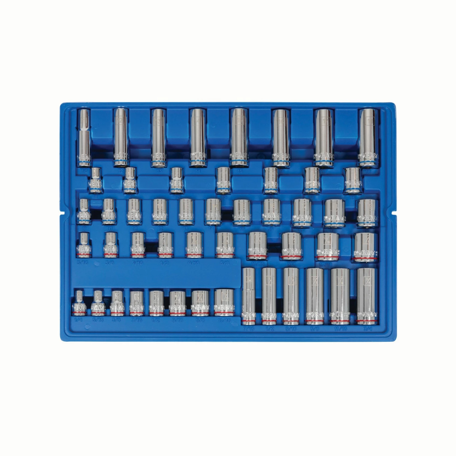- This set includes 1/4-in, 3/8-in and 1/2-in drive sockets, ratchets and other accessories – please see dimension guide document for full list of components included