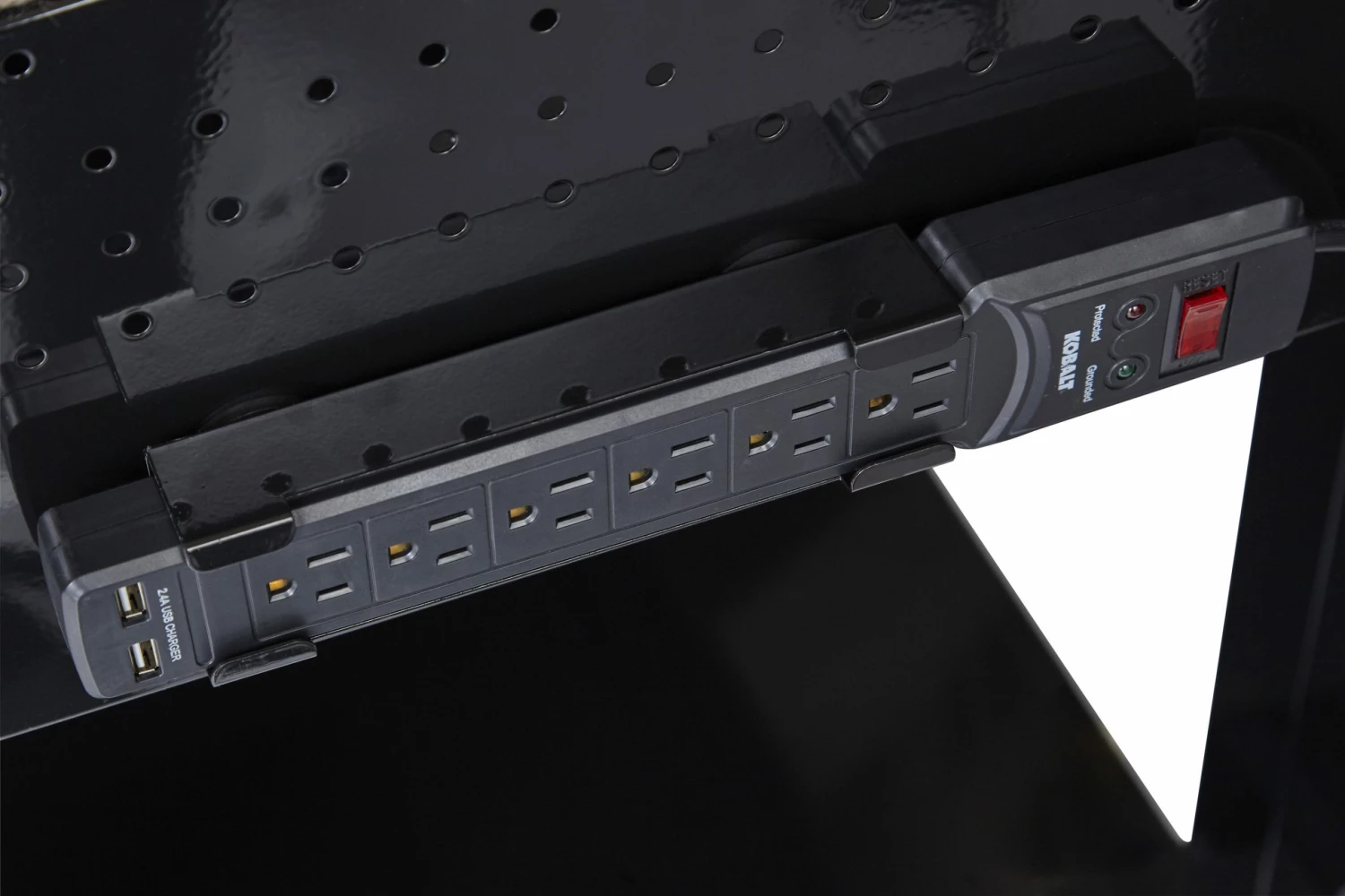 Give your garage, shop, craft space or workplace the extra storage and work space it needs with this Kobalt workbench. With its heavy-duty steel construction, it provides a sturdy place to tackle projects of all kinds, and has the ability to hold up to 1,100 lbs of tools, hardware and other accessories. Three drawers feature heavy-duty, ball-bearing slides so they are easy to open, and offer plenty of room for storing a variety of tools or accessories. Featuring a 3-receptacle power strip, you can conveniently plug in electric tools right at the bench, while 2 USB ports offer even more versatility. Keep your work space bright the florescent light bar and use the accessory hooks for more tools storage or a place towels. For a handy work surface and plenty of storage space, this workbench is the perfect choice.