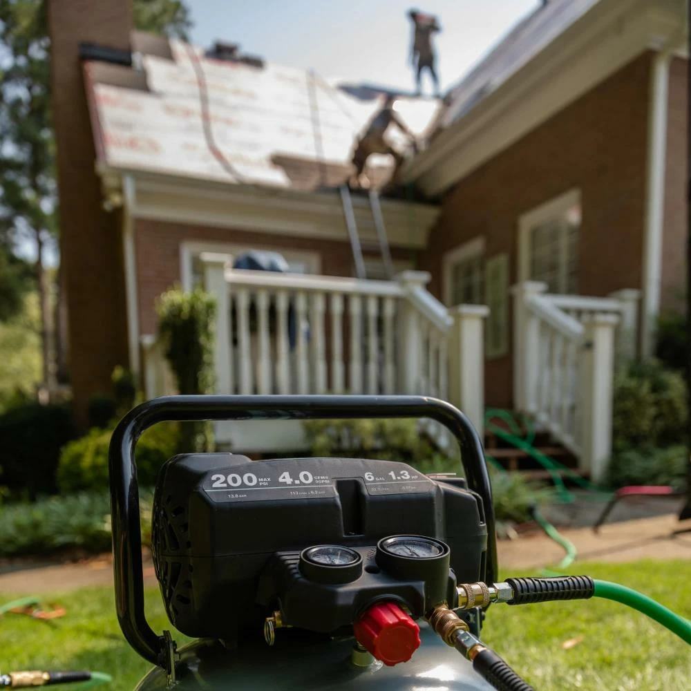 Metabo HPT is reinventing the jobsite compressor with THE TANK™. With class leading PSI and weighing only 41lbs, this lightweight compressor packs more pressure into a smaller body. It is engineered with the power to run a framing, roofing or siding crew, and versatile enough to run a team of five 18Ga nailers at a time. THE TANK offers serious pros a next level compressor, which provides the most demanding framer no downtime while driving nails flush. THE TANK has the capacity and PSI to simultaneously run (2) framing nailers or (2) siding nailers or (2) roofing nailers at the same rate of production as a traditional jobsite compressor. Finish crews can even run (3) 15Ga or 16Ga finish nailers or (5) 18Ga brad nailers. At 200 PSI and 4 CFM at 90 PSI, you can get more work done with less weight. THE TANK rolls through the toughest jobsites with the power and performance to get the job done!