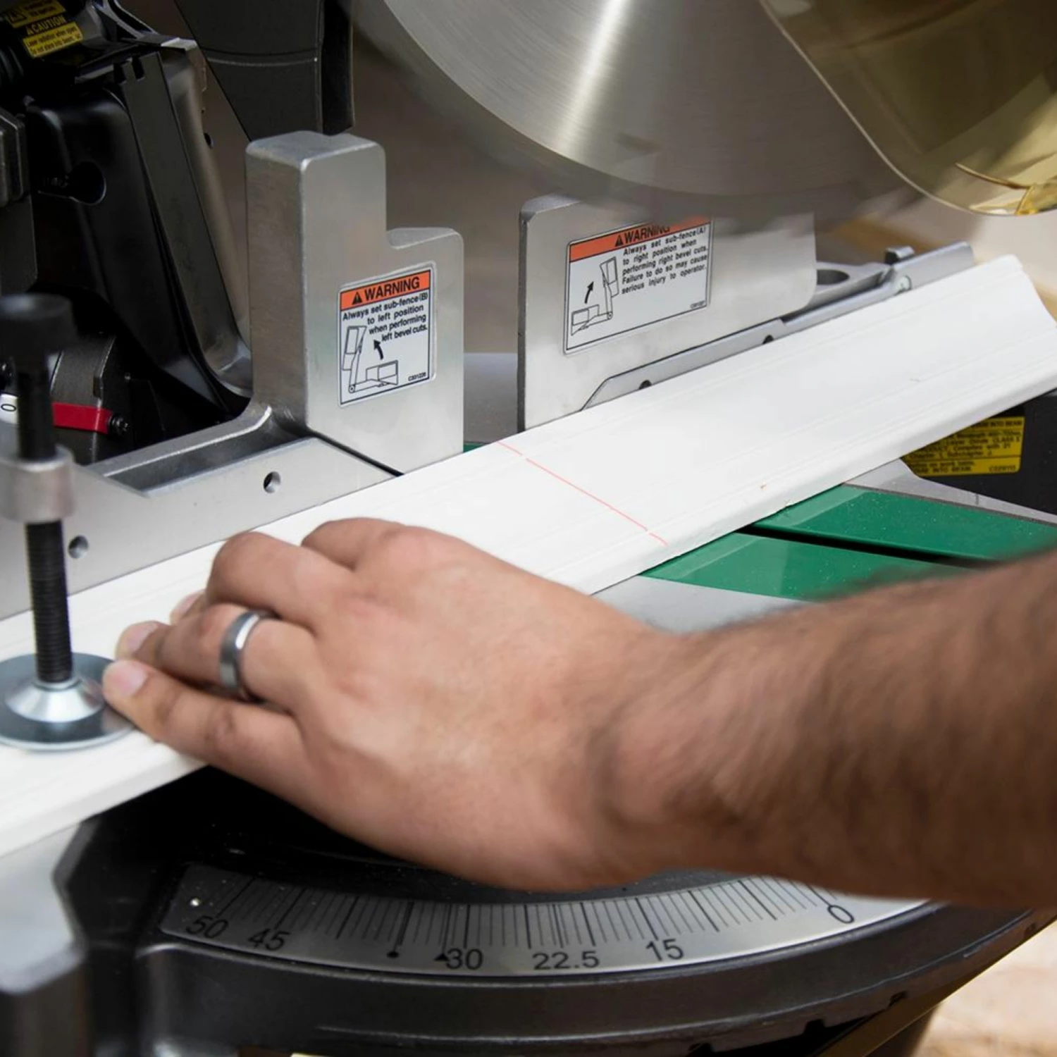 - FENCE: Tall, pivoting aluminum fence that stands at a height of 5-1/8 In. allows crown molding to be cut vertically