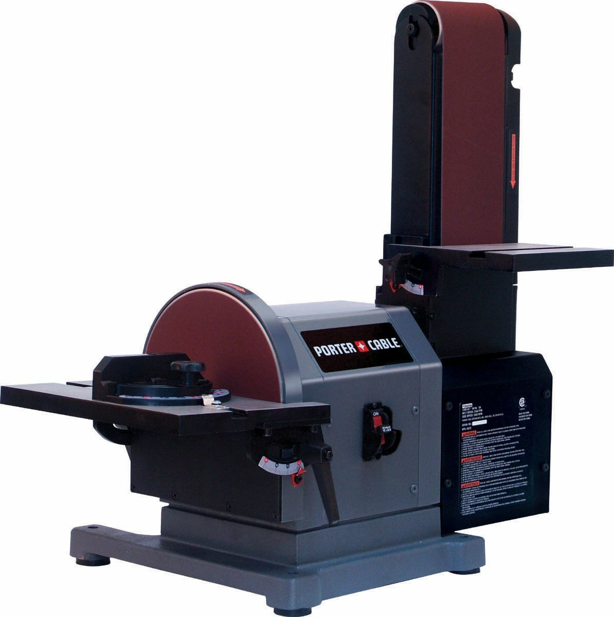Grinding down surface corners is easier and more efficient with this Porter-Cable 5 amp bench top sander. An induction ball-bearing 3/4 HP motor provides power for small or large operations on various materials, providing the flexibility you need to tackle different sanding tasks. Separate aluminum work tables for the sanding disc and belt provide a flat surface for accurate operation, and both tilt to 45 degree to help you get closer to your work piece. An easy-to-use belt tension control lever provides fast belt changes, and single-knob belt tracking adjustments help maintain proper alignment for improved precision. The cast-iron base reduces vibration and helps keeps the sander stable during use, preventing shifts while you’re cutting. The sanding belt tilts up to 90 degree vertical, and the unsupported underside allows for sanding of curved work pieces the dust collection system comes with a bag and an adjustable port to help you cut wood at the desired angle without a big mess.