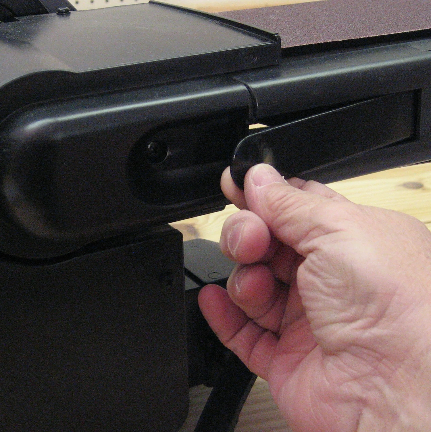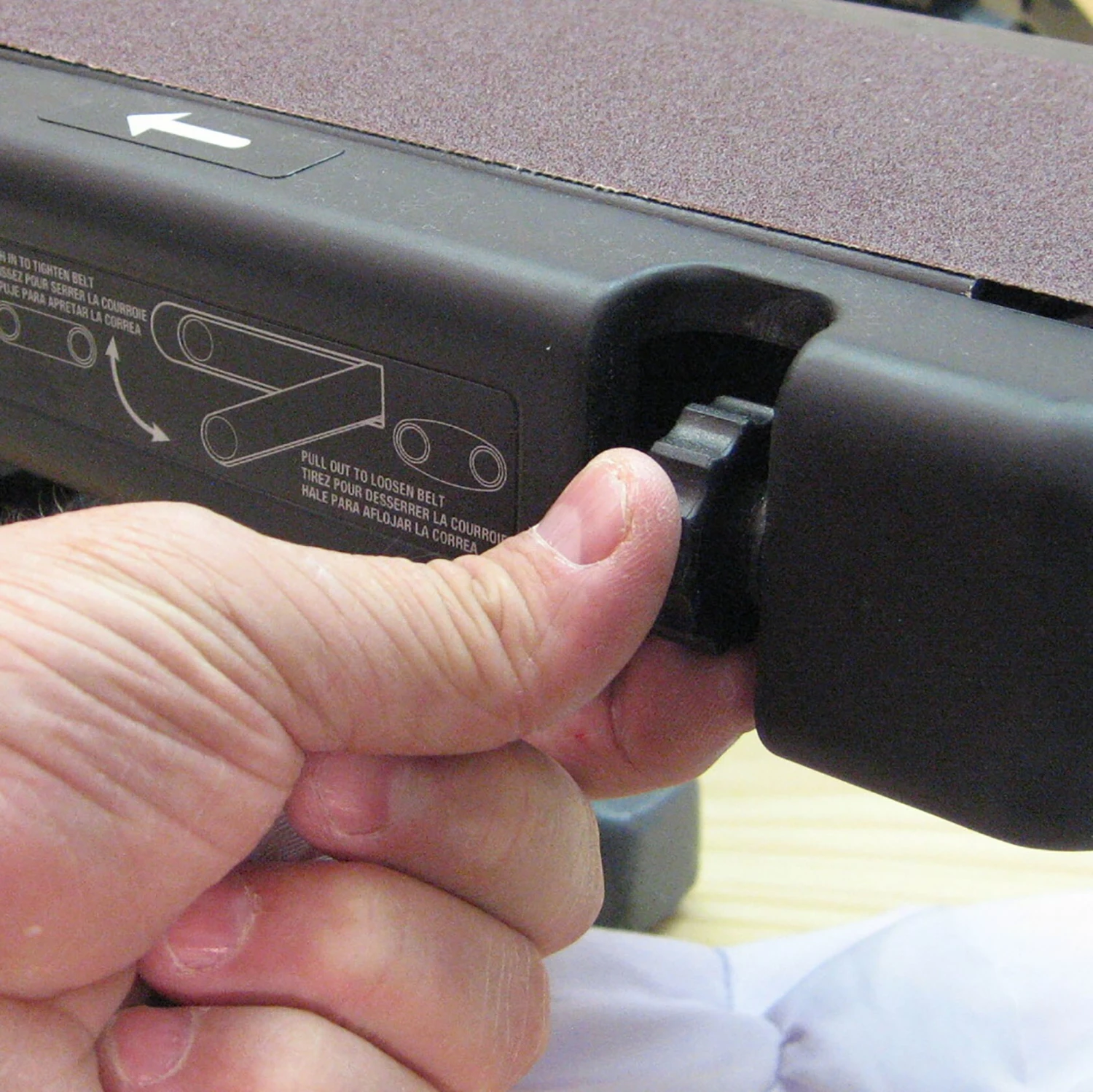 - Sanding belt tilts up to 90 degree vertical, and the unsupported underside allows for sanding of curved work pieces