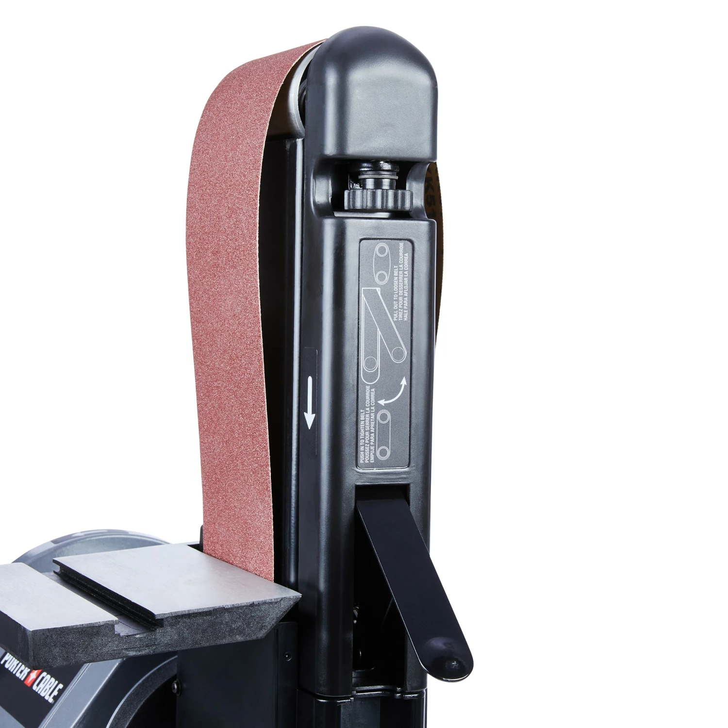 - Porter-Cable 5 amp bench top sander comes with a miter gauge, 4-in x 36-in sanding belt, 8-in sanding disc and dust bag