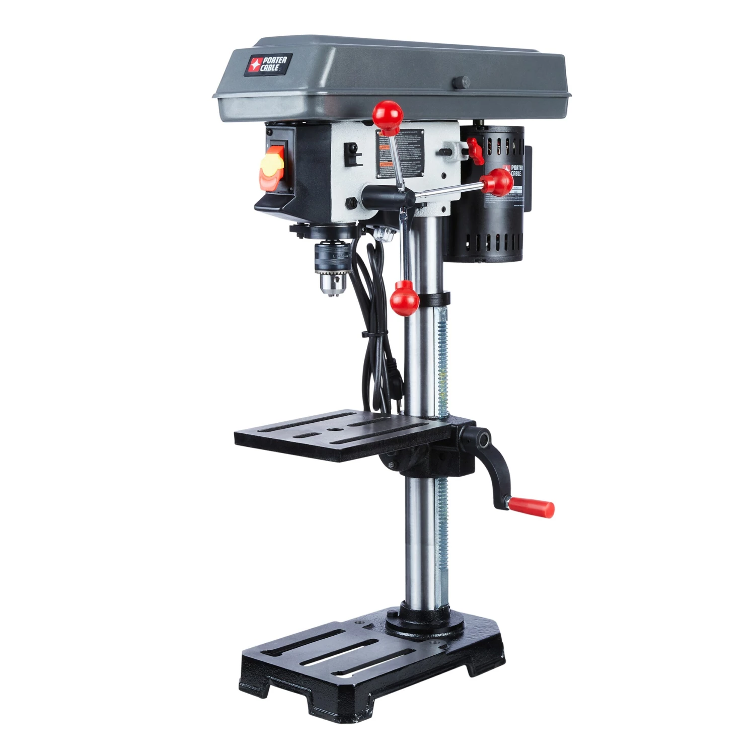 Compact for the home workshop but constructed for heavy duty projects the Porter Cable 10-in bench drill press is designed for years of use. The cast iron head, table and base provided a durable platform for accurate drilling and sanding a variety of materials from wood, metal and plastics. The five operating speeds allow for quick and easy adjustment of the speeds for the right drill bit or material. The 1/2-in keyed chuck has a 2-in overall travel for drilling into the center of 10-in diameter work pieces. The rack and pinion table elevation system provides for quick setups. The LED light located under the drill head provides increased illumination of the work table area. The table tilts up to 45 degrees right or left for a range for angle drilling.
