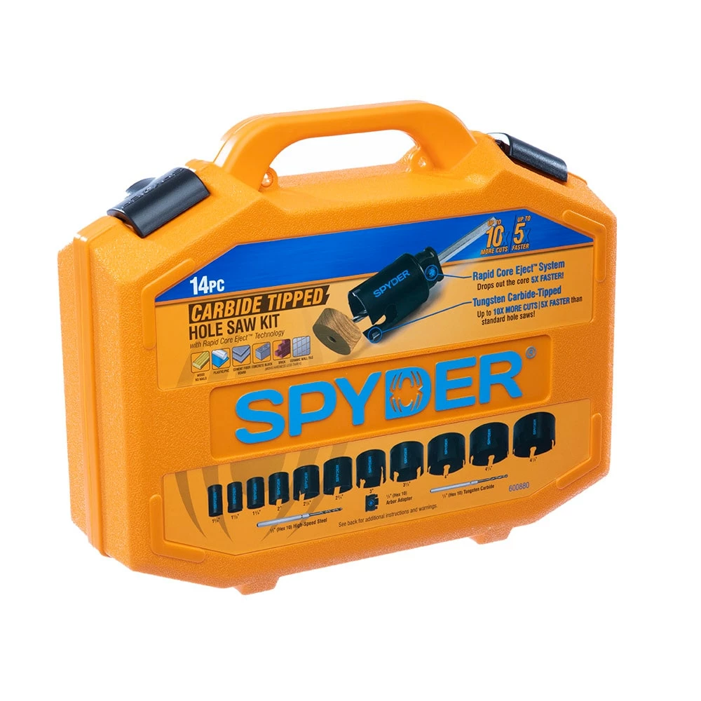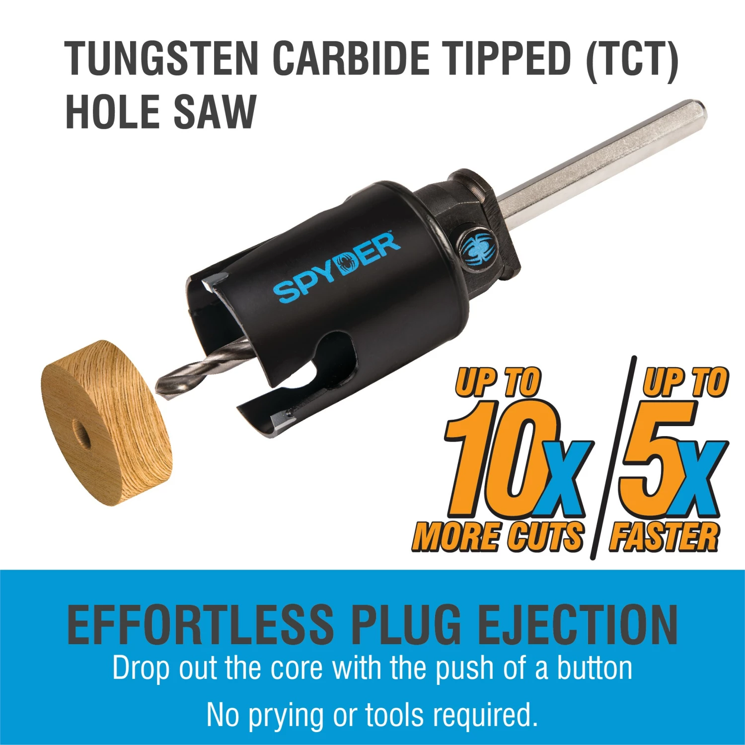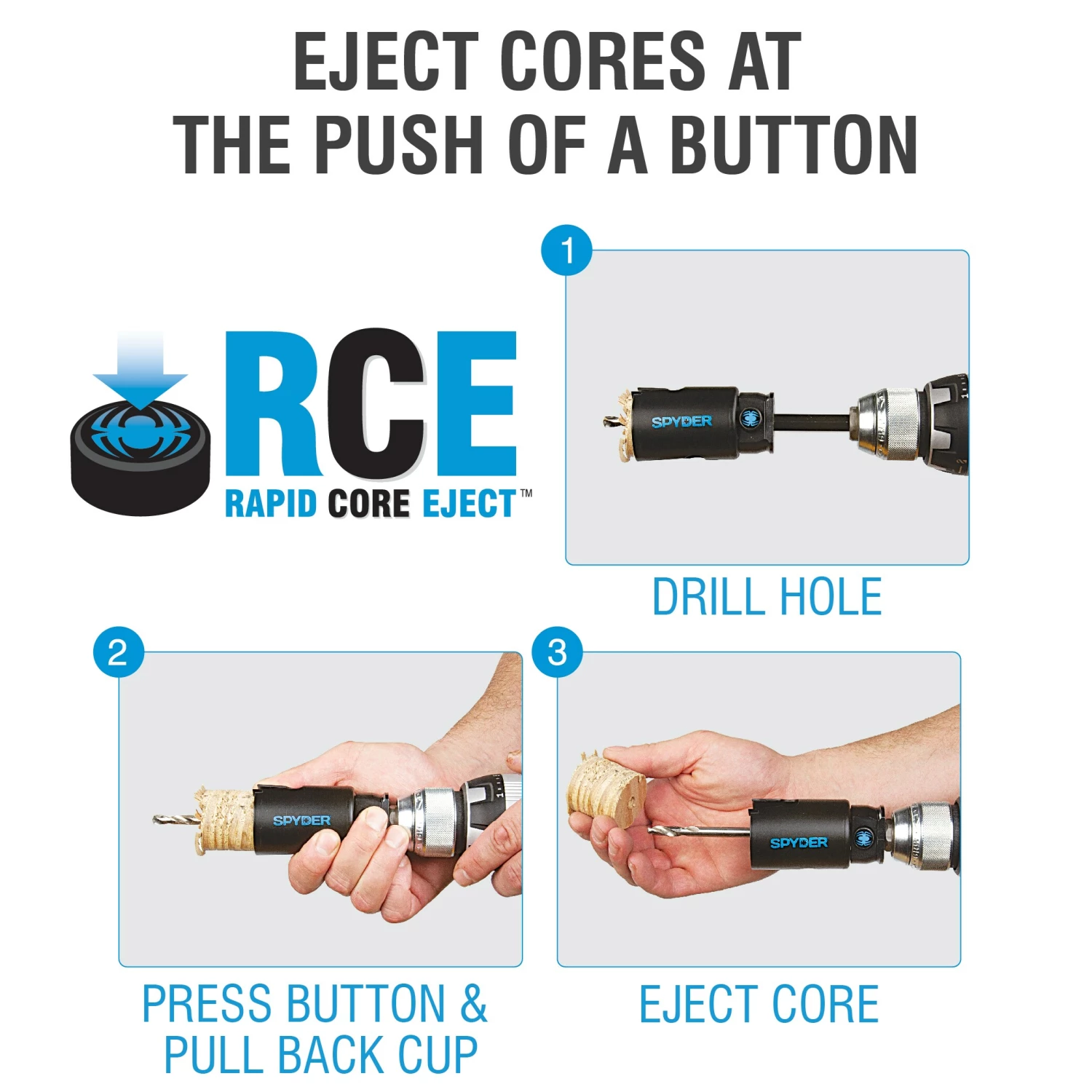 Spyder’s TCT hole saws cut more materials, faster, and last longer than conventional bi-metal saws. Use Spyder’s Rapid Core Eject arbor system to remove cores without prying – drill hole, press button, pull back the hole saw, and eject the core. Cut at an angle, and use two adapters (second adapter sold separately) on one pilot bit to enlarge existing holes. All Spyder hole saws fit on Spyder Rapid Core Eject arbor/pilot bits, and on universal hole saw arbors. Up to 10x more cuts and 5x faster than standard bi-metal hole saws – effortlessly eject the core with the push of a button.