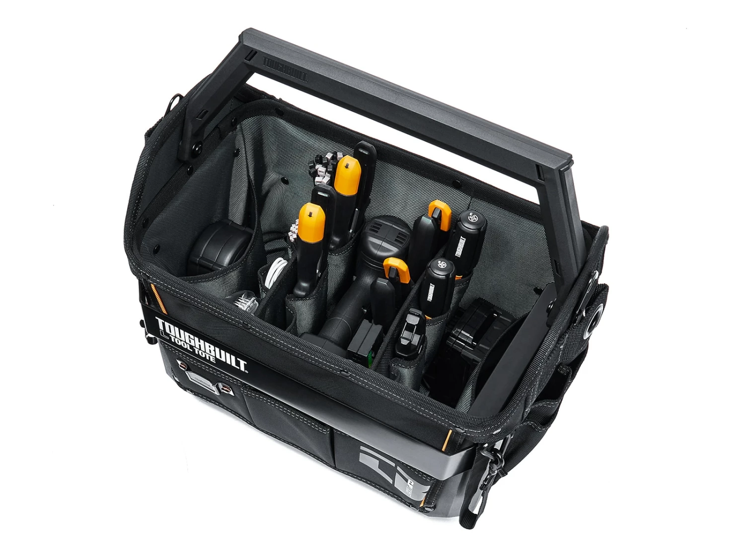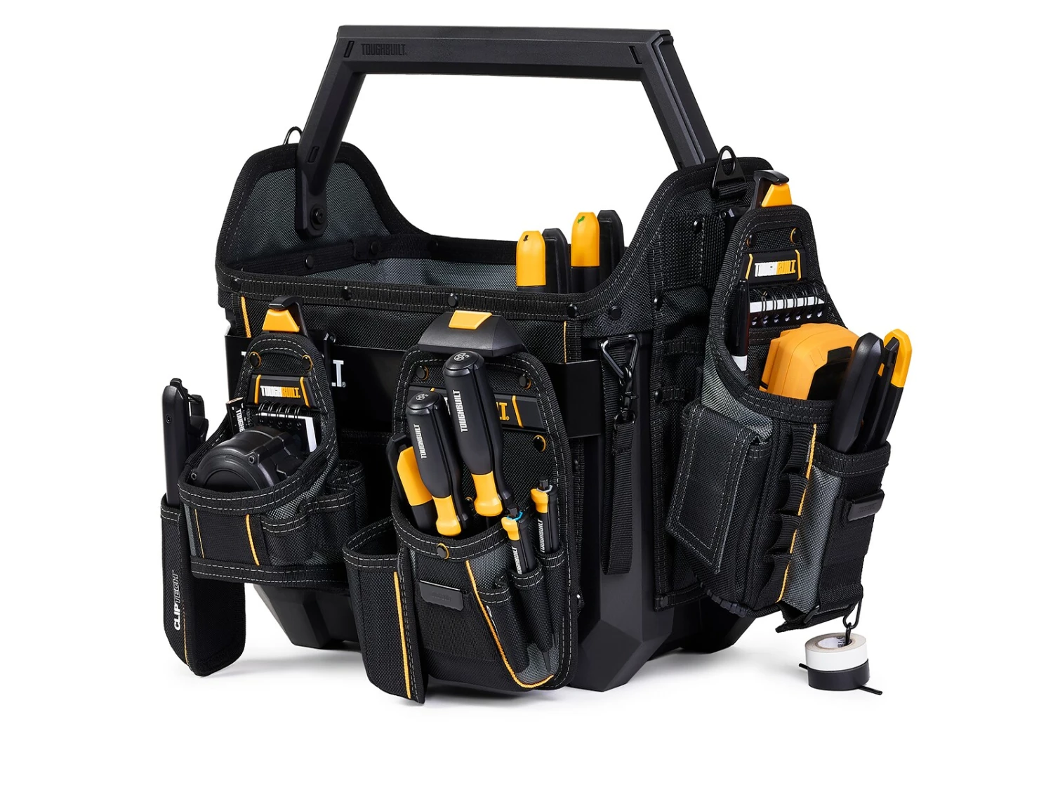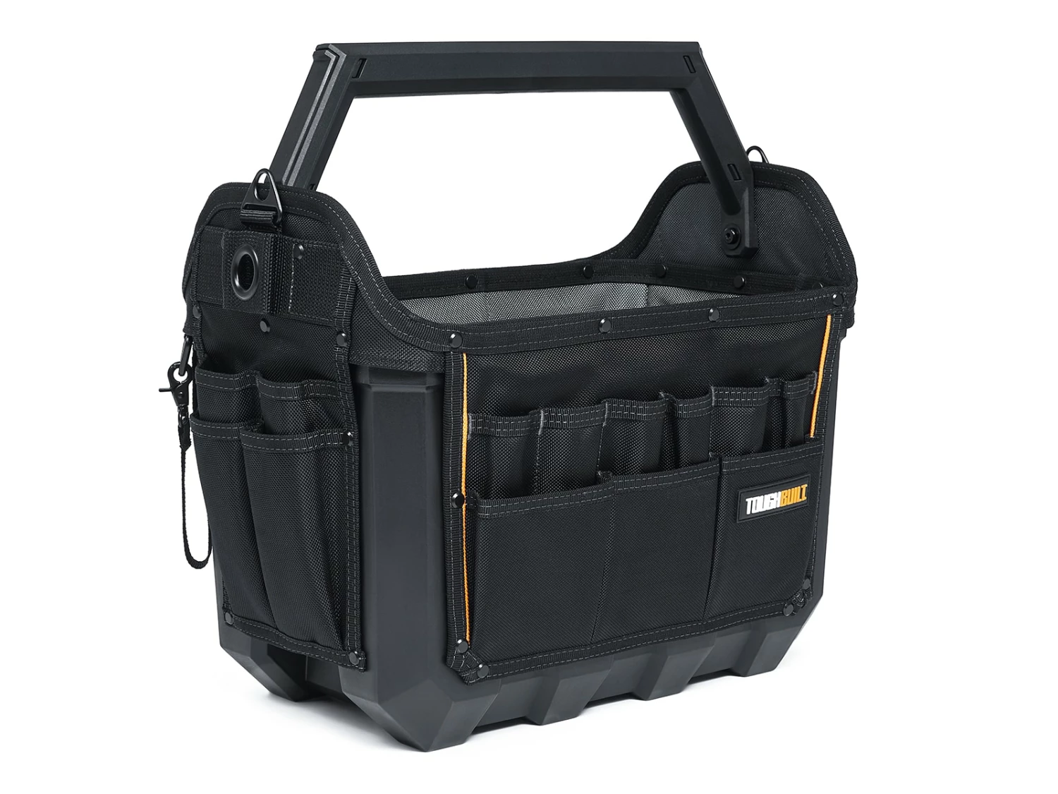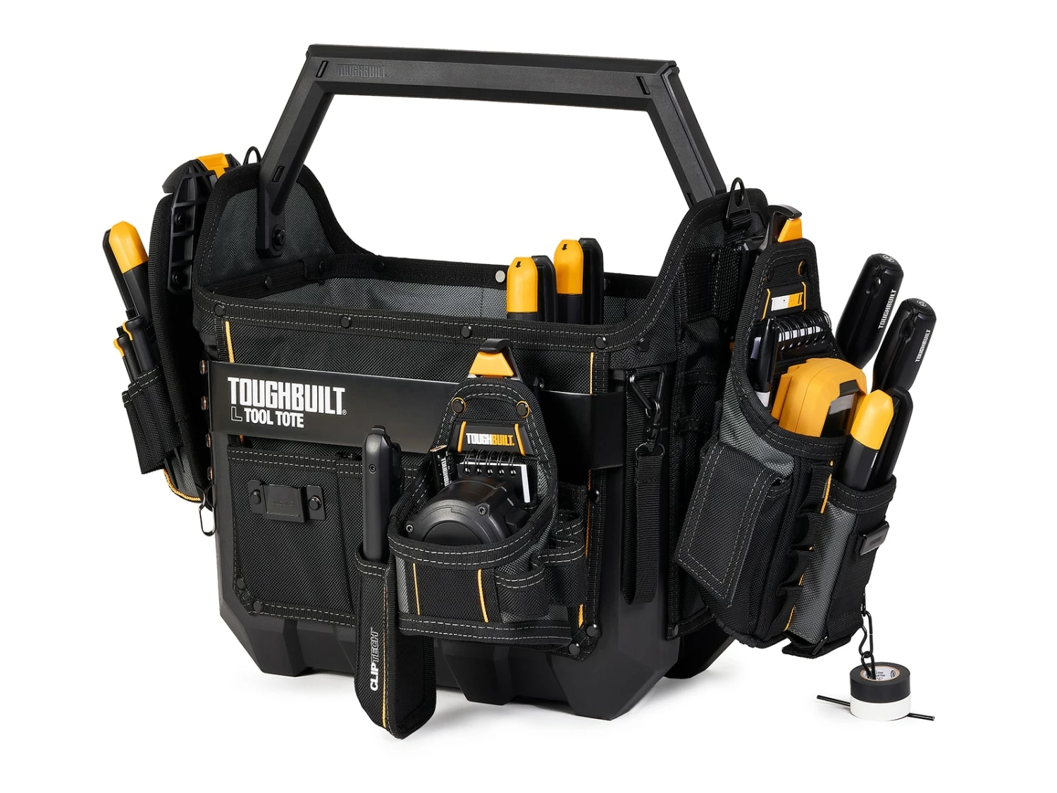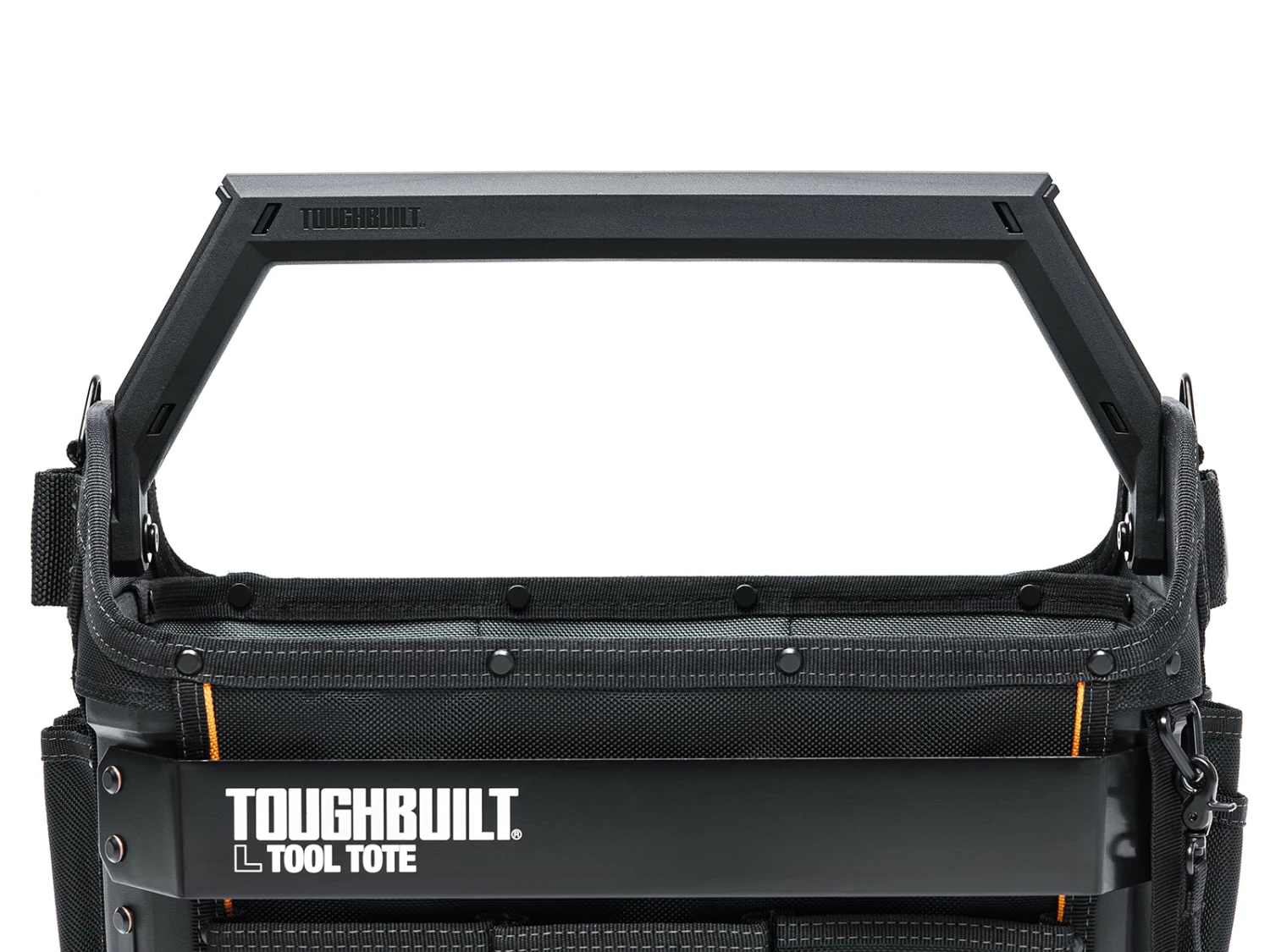 Organize your tools faster and easier.The ToughBuilt® Large Tool Tote transforms how professionals carry tools and supplies. It is compatible with all ToughBuilt clip-on pouches for the most efficient tool organization.The hard body construction outlasts any fabric tote. Made with high-quality PP+HDPE plastics, 1680D fabric, and heavy-duty steel hardware. Its versatile structured external pockets flex to securely hold tools in place and internal pockets keep tools within easy reach. This hard-working tote keeps up with the professional’s rigorous demands and is backed by our Limited Lifetime Warranty.