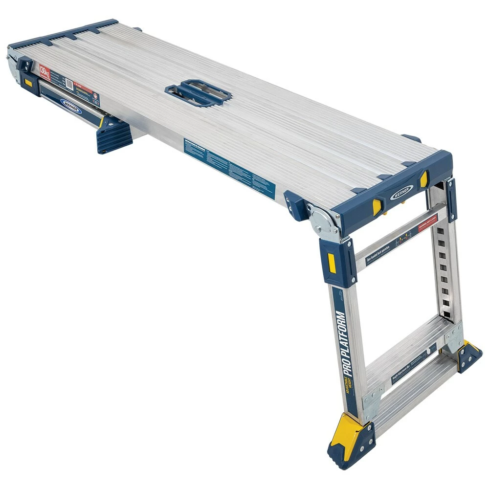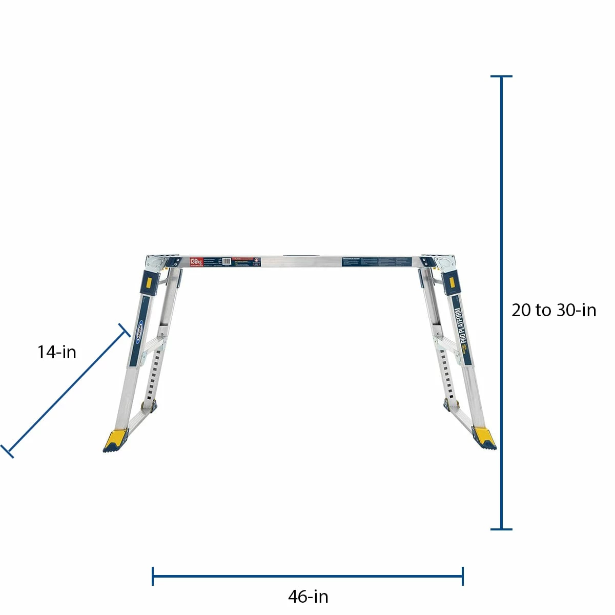 The AP-2030-MP3 Aluminum Adjustable Height Pro Platform 300lb Load Capacity is height adjustable, providing up to a 9ft reach. The 46in x 14in work platform size is compact and lightweight, making it easier to transport. The height adjustability and plastic bumpers allow for the Adjustable Pro Work Platform to be used on stairs without damaging finished surfaces. The work platform is quick to set up with one handed lock and height adjustments. The wide feet provide stability without the need for manual adjustment.
