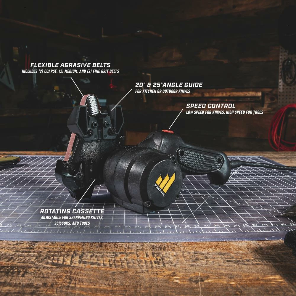 The Mk.2 Knife and Tool Sharpener is an improvement upon the original Work Sharp Knife and Tool Sharpener; which was the first knife sharpener designed to sharpen every knife you own. Building on that success the new Mk.2 provides even more sharpening benefit for the avid knife user. Using 1/2” x 12” flexible abrasive belts in coarse, medium and fine grits (P80, P220, 6000) the sharpener is able to sharpen not just straight bladed knives, but also curved knives, tanto blades, filet knives, serrated knives, gut hooks and virtually any other shape of knife blade. The Mk.2 provides an improved precision sharpening guides to ensure that you get the proper angle every time. Quickly toggle between the 25Ð angle for hunting and outdoor knives and the 20Ð angle for thinner blades and kitchen knives. The New Sharpening Guide also provides an Edge Guide to support the blade during the entire process making it more precise and repeatable. New two speed power delivers a low speed for more control when sharpening a knife, yet still provides all the power you need for heavier sharpening and grinding tasks on tools like lawnmower blades, axes and other common lawn and garden tools. Speed control is ergonomically placed within reach to make speed adjustments fast and easy when sharpening. This combination of speed control, precision guide and flexible abrasive belts let you sharpen your blades to hair popping results with speed, ease and repeatability. This is the fastest and easiest way to get your knives as sharp as you need them to be. Stop tolerating dull knives and time consuming sharpening methods! Professional knife makers use flexible belts to put a razor sharp edge on their blades, and now you can have the same technology at home to use any time your knives get dull. You may already have other sharpening methods, but never before has a knife sharpener been able to quickly and easily sharpen this broad range of knives to such extremely sharp results.